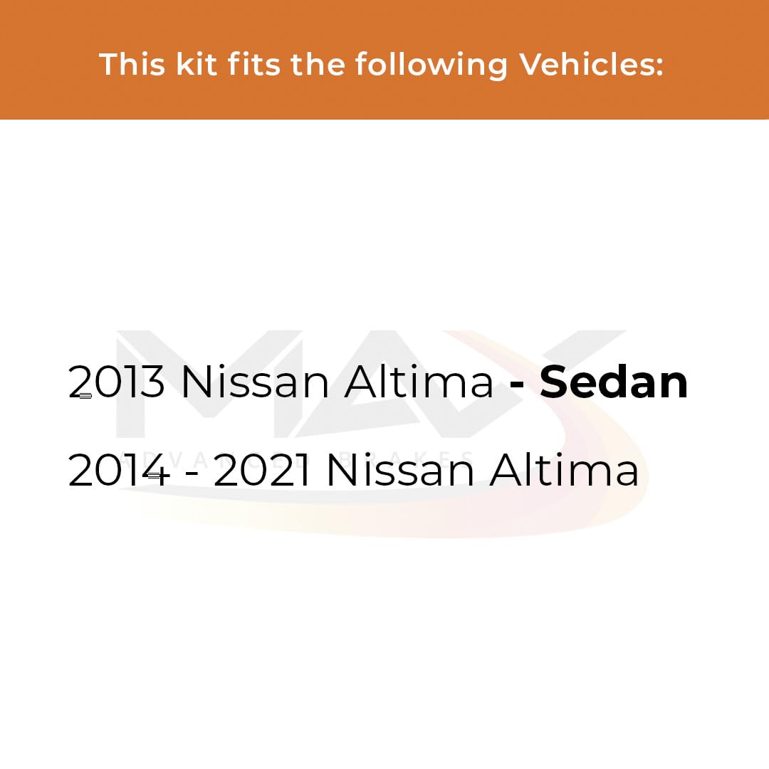 Q: What vehicles are compatible with the Max Advanced Brakes Front Brake Kit?A: The Max Advanced Brakes Front Brake Kit is specifically designed to fit 2013-2021 Nissan Altima Sedan models. To ensure compatibility, please verify your vehicle's details such as Year, Model, Sub-Model, Engine Size, and VIN# during the ordering process.