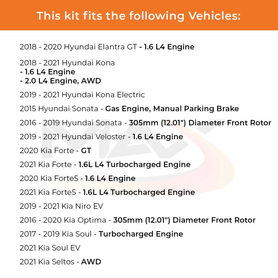 Q: Is the Max Advanced Brakes Front Brake Kit compatible with my 2015-2019 Hyundai Sonata?A: Yes, the Max Advanced Brakes Front Brake Kit is specifically designed for the 2015-2019 Hyundai Sonata and is compatible with various models including those with MPB. To ensure proper fitment, please verify your vehicle's details such as Year, Model, Sub-Model, Engine Size, and more during the ordering process.