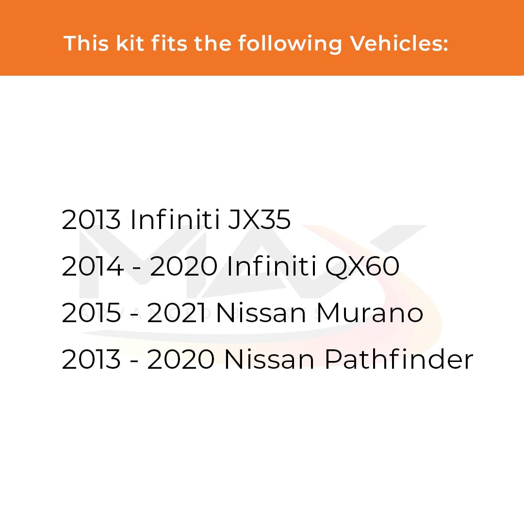 Q: What vehicles are compatible with the Max Advanced Brakes Front Brake Kit?A: The Max Advanced Brakes Front Brake Kit is specifically designed to fit 2015-2021 Nissan Murano, 2013-2020 Pathfinder, and 2014-2020 Infiniti QX60 models. It's crucial to verify your vehicle's Year, Model, and other specifications during the ordering process to ensure a perfect fit.