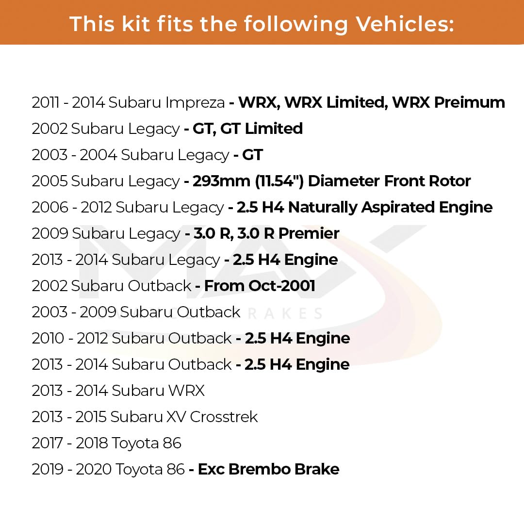 Q: What vehicles are compatible with the Max Advanced Brakes Front Brake Kit?A: The Max Advanced Brakes Front Brake Kit is compatible with a wide range of Subaru models including the 2003-2018 Forester, 2002-2014 Impreza, 2010-2017 Outback, 2010-2016 Legacy, 2016-2017 Crosstrek, and 2013-2020 BRZ, as well as the 2005-2006 Saab 9-2X and 2013-2016 Scion FR-S. Be sure to verify your vehicle's details for optimal fitment.