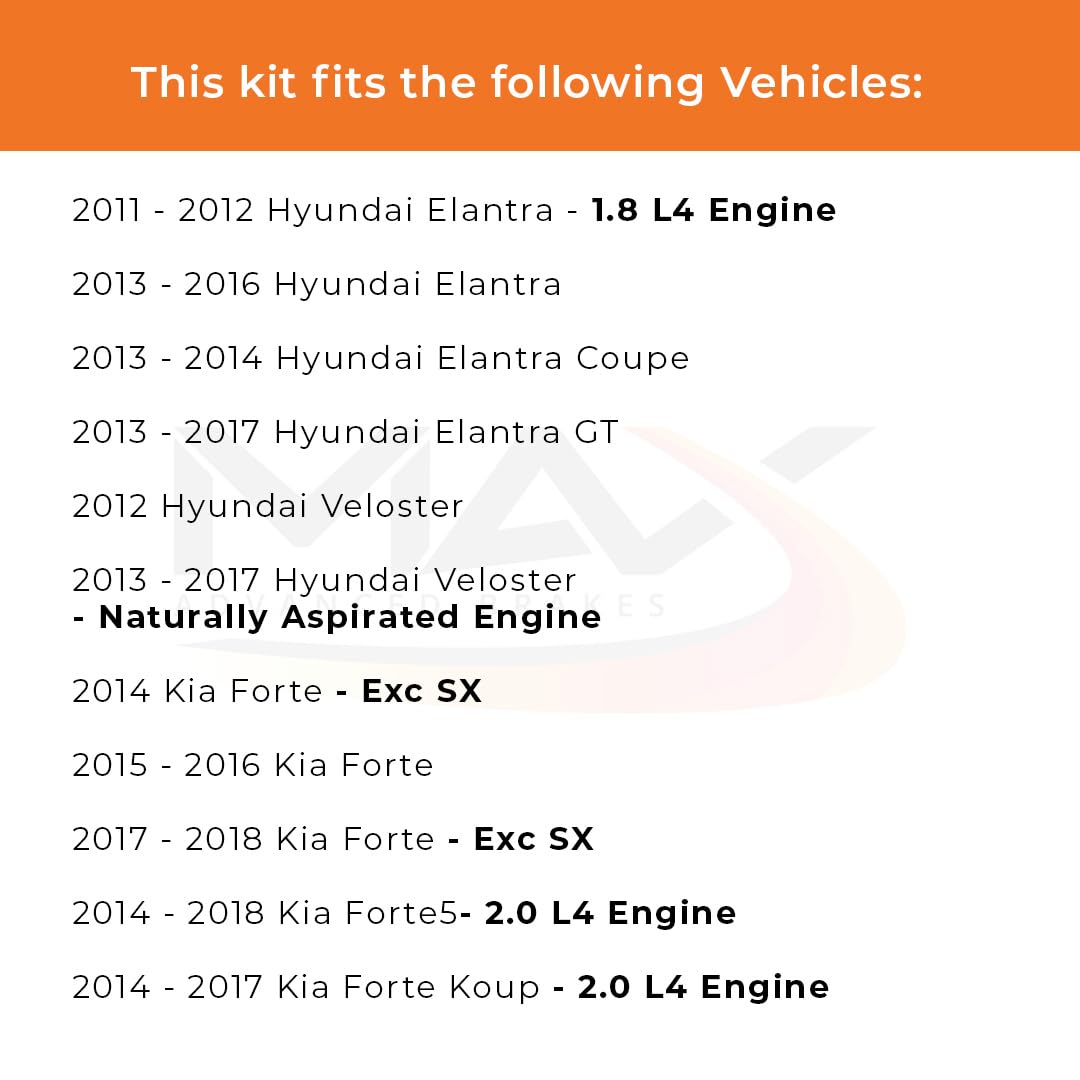 Q: What vehicles are compatible with the Max Advanced Brakes Front & Rear Brake Kit?A: The Max Advanced Brakes Front & Rear Brake Kit is compatible with various models, including the 2011-2012 Hyundai Elantra with a 1.8 L4 Engine, the 2013-2016 Elantra, the 2013-2014 Elantra Coupe, the 2013-2017 Elantra GT, the 2012 Veloster, and the 2013-2017 Veloster Naturally Aspirated Engine. It also fits the 2014-2018 Kia Forte and Forte5 models, and the 2014-2017 Forte Koup with a 2.0 L4 Engine.