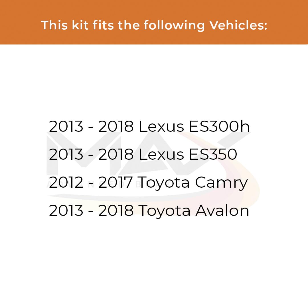 Q: What vehicles are compatible with the Max Advanced Brakes Front & Rear Brake Kit?A: This brake kit is compatible with 2012-2017 Toyota Camry, 2013-2018 Avalon, and 2013-2018 Lexus ES300h and ES350 models. Please ensure to verify your specific vehicle details for guaranteed fitment.