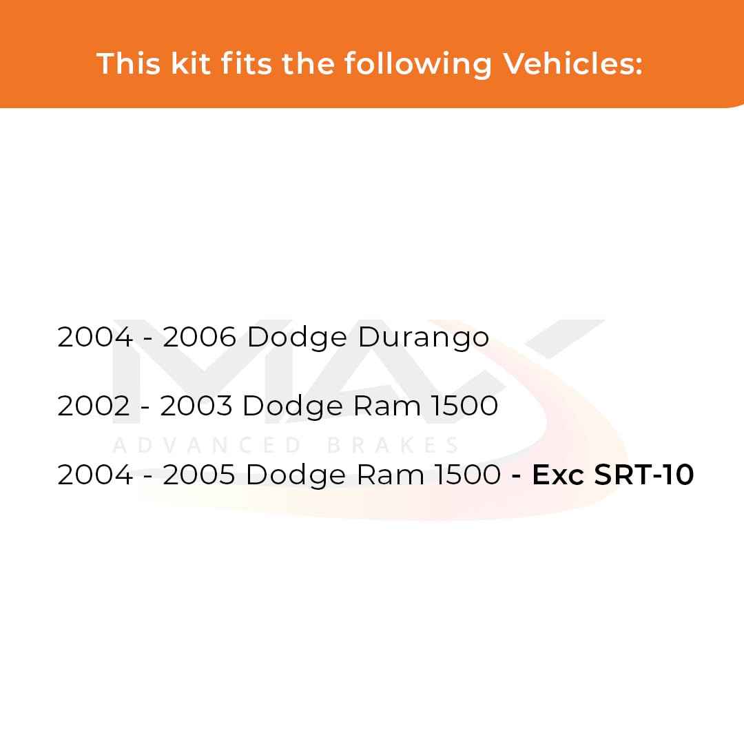 Q: What vehicles are compatible with the Max Advanced Brakes Front & Rear Brake Kit?A: The Max Advanced Brakes Front & Rear Brake Kit is compatible with the 2004, 2005, and 2006 Dodge Durango, as well as the 2002, 2003, 2004, and 2005 Dodge Ram 1500 models, including the 2004 and 2005 Dodge Ram 1500 Exc SRT-10.