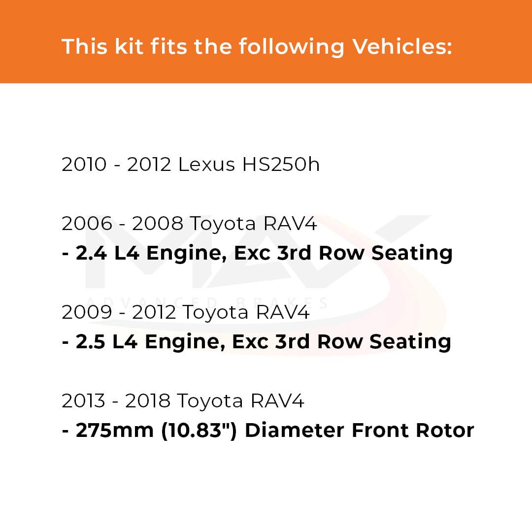 Q: What vehicles are compatible with the Max Advanced Brakes Front & Rear Brake Kit?A: The Max Advanced Brakes Front & Rear Brake Kit is compatible with 2006-2018 Toyota RAV4 models that have a 10.83" front rotor and do not feature a 3rd row seating option. It also fits the 2010-2012 Lexus HS250h.