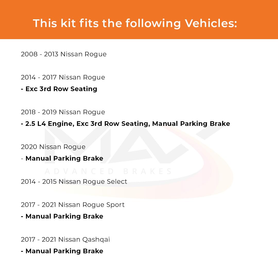 Q: What vehicles are compatible with the Max Advanced Brakes Front & Rear Brake Kit?A: The Max Advanced Brakes Front & Rear Brake Kit is compatible with Nissan Rogue models from 2008 to 2020 and Nissan Rogue Sport (Qashqai) models from 2017 to 2021, ensuring a perfect fit for your vehicle.
