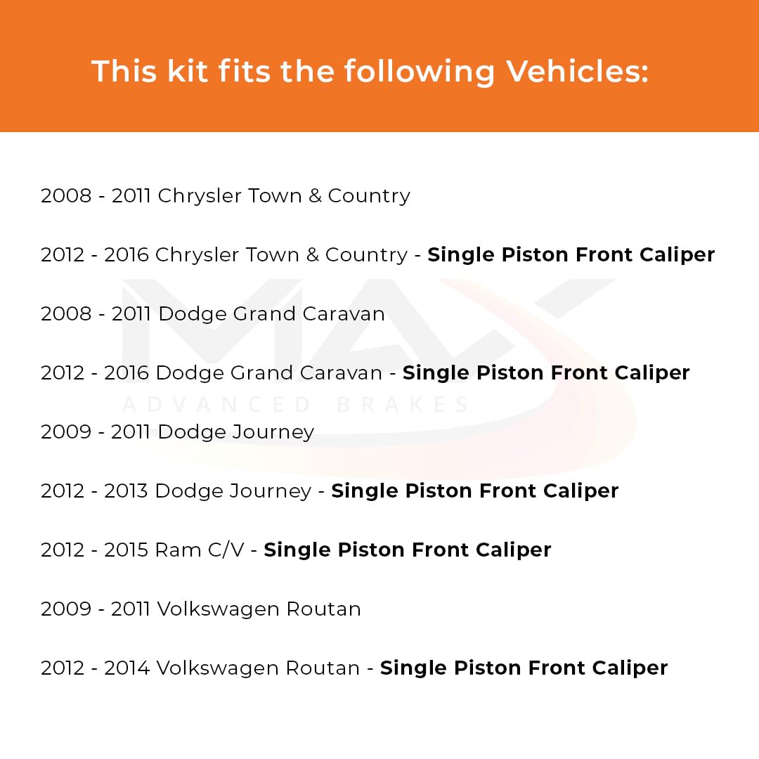 Q: What vehicles are compatible with the Max Advanced Brakes Front & Rear Brake Kit?A: The Max Advanced Brakes Front & Rear Brake Kit is compatible with various models, including the 2008-2016 Dodge Grand Caravan, 2008-2011 Chrysler Town & Country, and the 2009-2011 Volkswagen Routan, among others. It's designed for vehicles with a single piston front caliper.