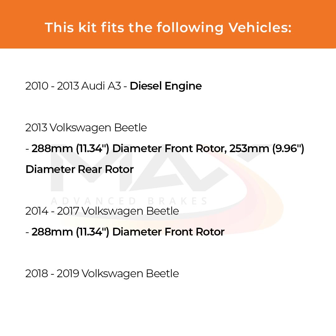 Q: What vehicles are compatible with the Max Advanced Brakes Front & Rear Brake Kit?A: The Max Advanced Brakes Front & Rear Brake Kit is compatible with 2011-2018 Volkswagen Jetta and 2013-2019 Beetle, as well as the 2010-2013 Audi A3. It's important to verify your vehicle's details to ensure a perfect fit.