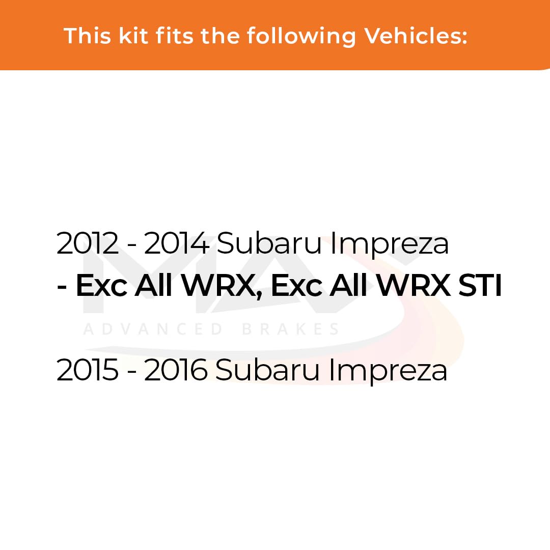 Q: What vehicles are compatible with the Max Advanced Brakes Front & Rear Brake Kit?A: The Max Advanced Brakes Front & Rear Brake Kit is specifically designed for the 2012-2014 Subaru Impreza Exc All WRX and WRX STI models from 2015 and 2016. To ensure compatibility, please verify your vehicle's year, model, and other specifications before purchasing.