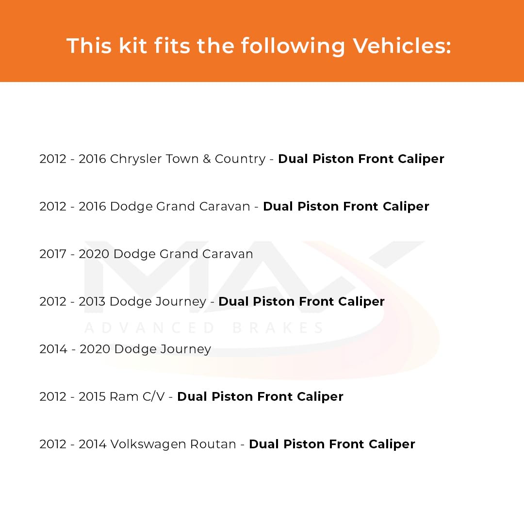 Q: What vehicles are compatible with the Max Advanced Brakes Front & Rear Brake Kit?A: The Max Advanced Brakes Front & Rear Brake Kit is compatible with various models including the 2012-2020 Dodge Grand Caravan, 2012-2020 Chrysler Town & Country, 2012-2020 Dodge Journey, and 2012-2014 Ram C/V, specifically designed for vehicles with dual piston front calipers.
