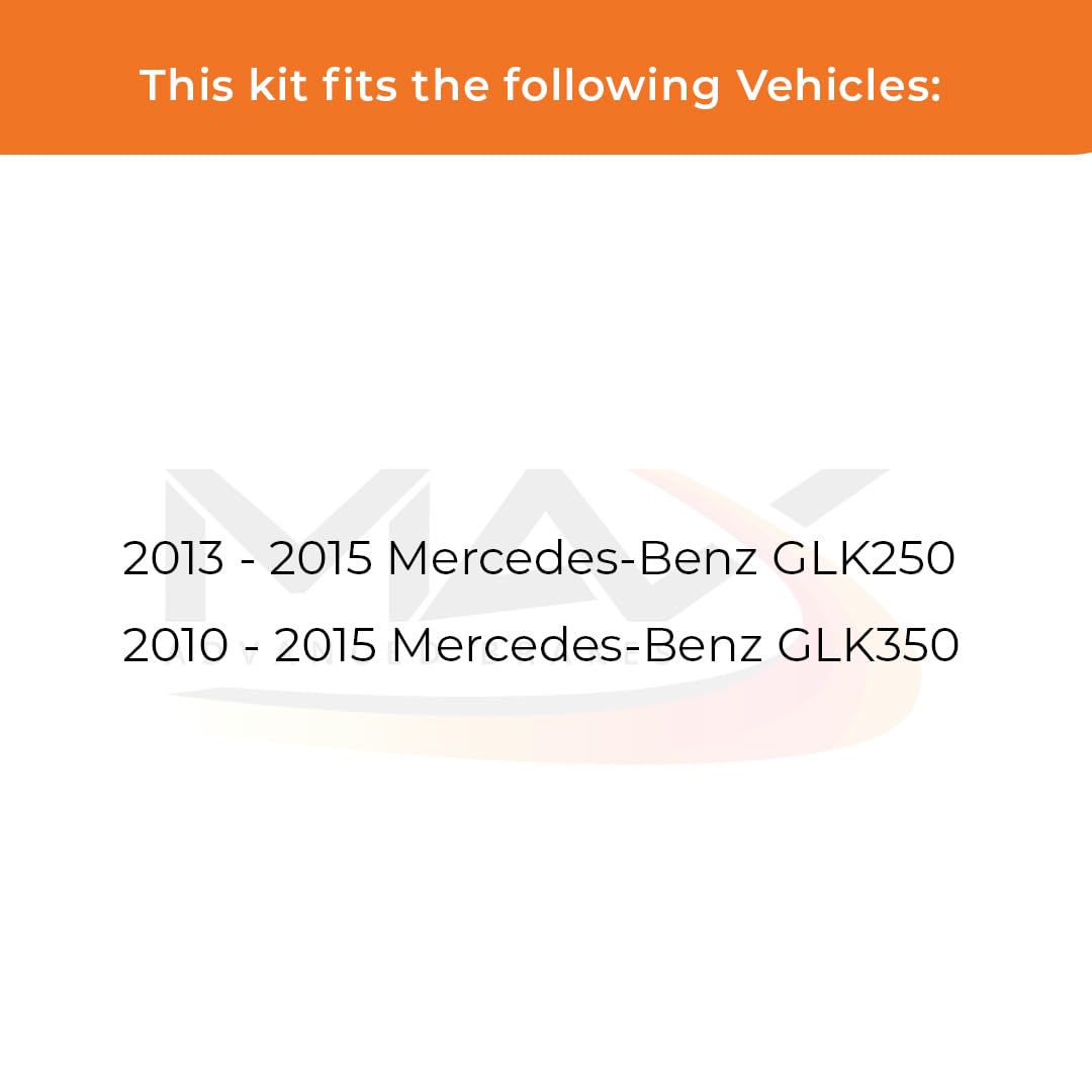 Q: What vehicles are compatible with the Max Advanced Brakes Front & Rear Brake Kit?A: The Max Advanced Brakes Front & Rear Brake Kit is specifically designed for 2013, 2014, and 2015 Mercedes-Benz GLK250, as well as 2010 to 2015 GLK350 models. Ensure to verify your vehicle's details such as Year, Model, and Sub-Model before purchasing for proper fitment.