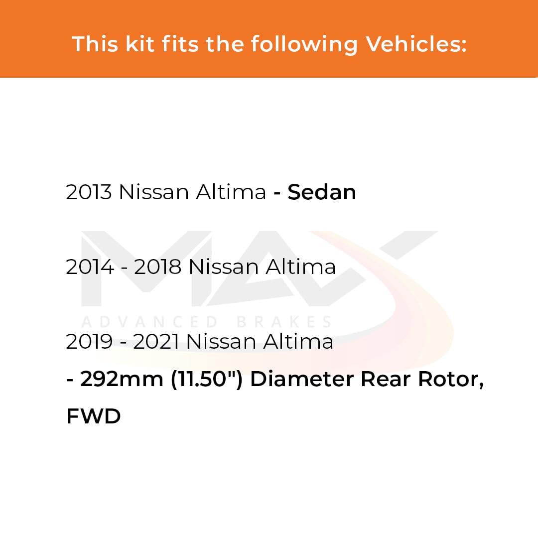 Q: What vehicles are compatible with the Max Advanced Brakes Front & Rear Brake Kit?A: The Max Advanced Brakes Front & Rear Brake Kit is specifically designed for the 2013-2021 Nissan Altima models. It is crucial to verify the vehicle's Year, Model, Sub-Model, Engine Size, and other specifications to ensure a perfect fit.