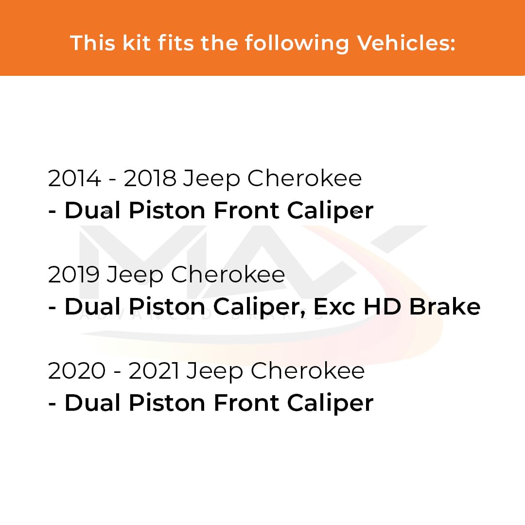 Q: What vehicles are compatible with the Max Advanced Brakes Front & Rear Brake Kit?A: This brake kit is specifically designed for the 2014 to 2021 Jeep Cherokee models equipped with dual piston front calipers. To ensure proper fitment, please verify your vehicle's details including year, model, and sub-model before purchase.
