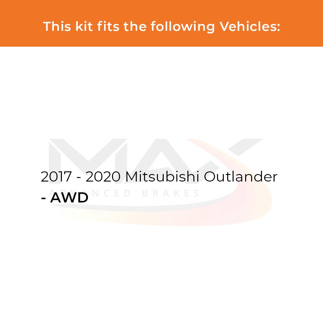 Q: What vehicles are compatible with the Max Advanced Brakes Front & Rear Brake Kit?A: The Max Advanced Brakes Front & Rear Brake Kit is specifically designed for the 2017, 2018, 2019, and 2020 Mitsubishi Outlander AWD. To ensure a perfect fit, please verify your vehicle's details such as Year, Model, Sub-Model, and Engine Size during the ordering process.