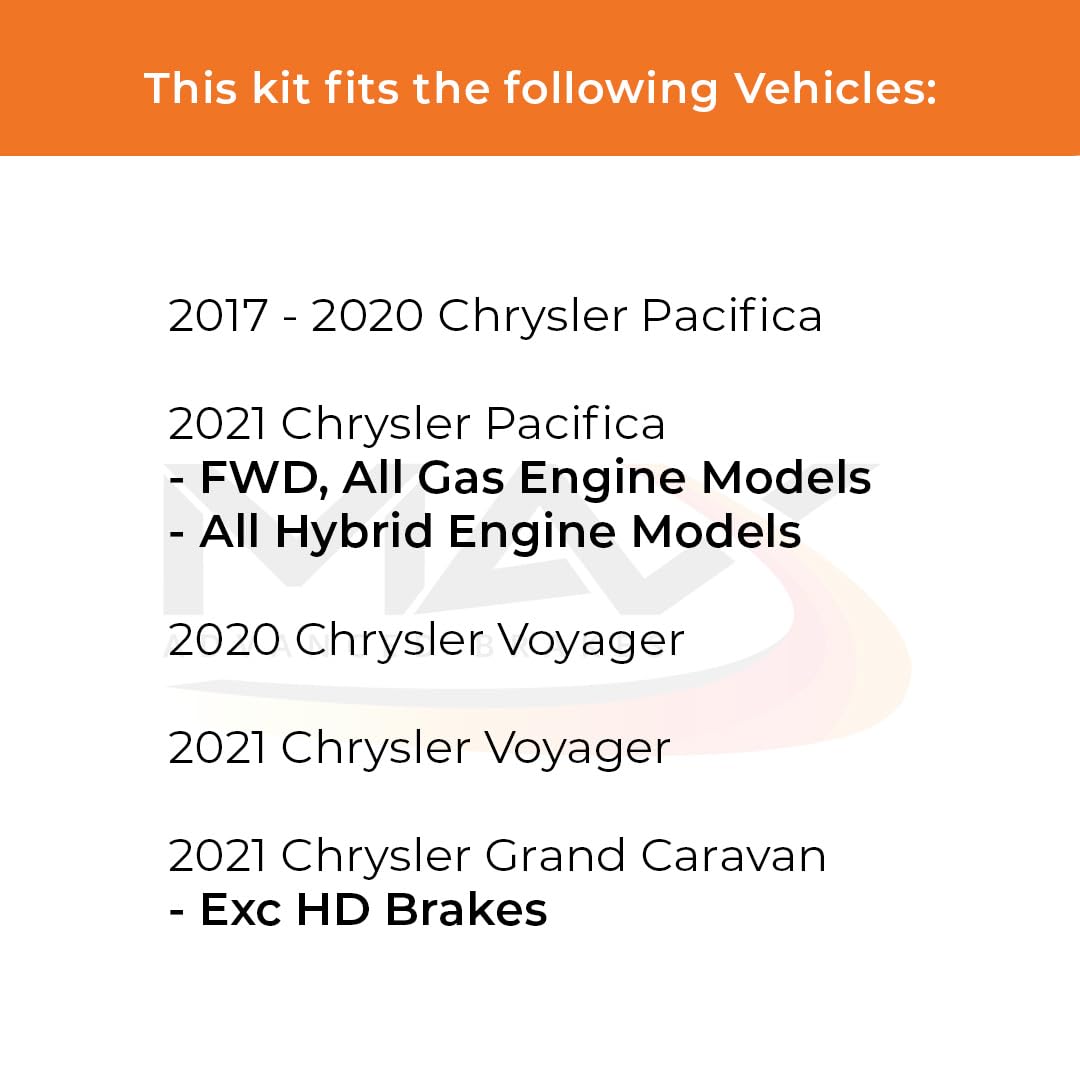 Q: What vehicles are compatible with the Max Advanced Brakes Front & Rear Brake Kit?A: The Max Advanced Brakes Front & Rear Brake Kit is designed to fit 2017-2021 Chrysler Pacifica, 2020-2021 Voyager, and 2021 Grand Caravan models. It is crucial to verify your vehicle's details, including Year, Model, Sub-Model, Engine Size, and other specifications to ensure compatibility.