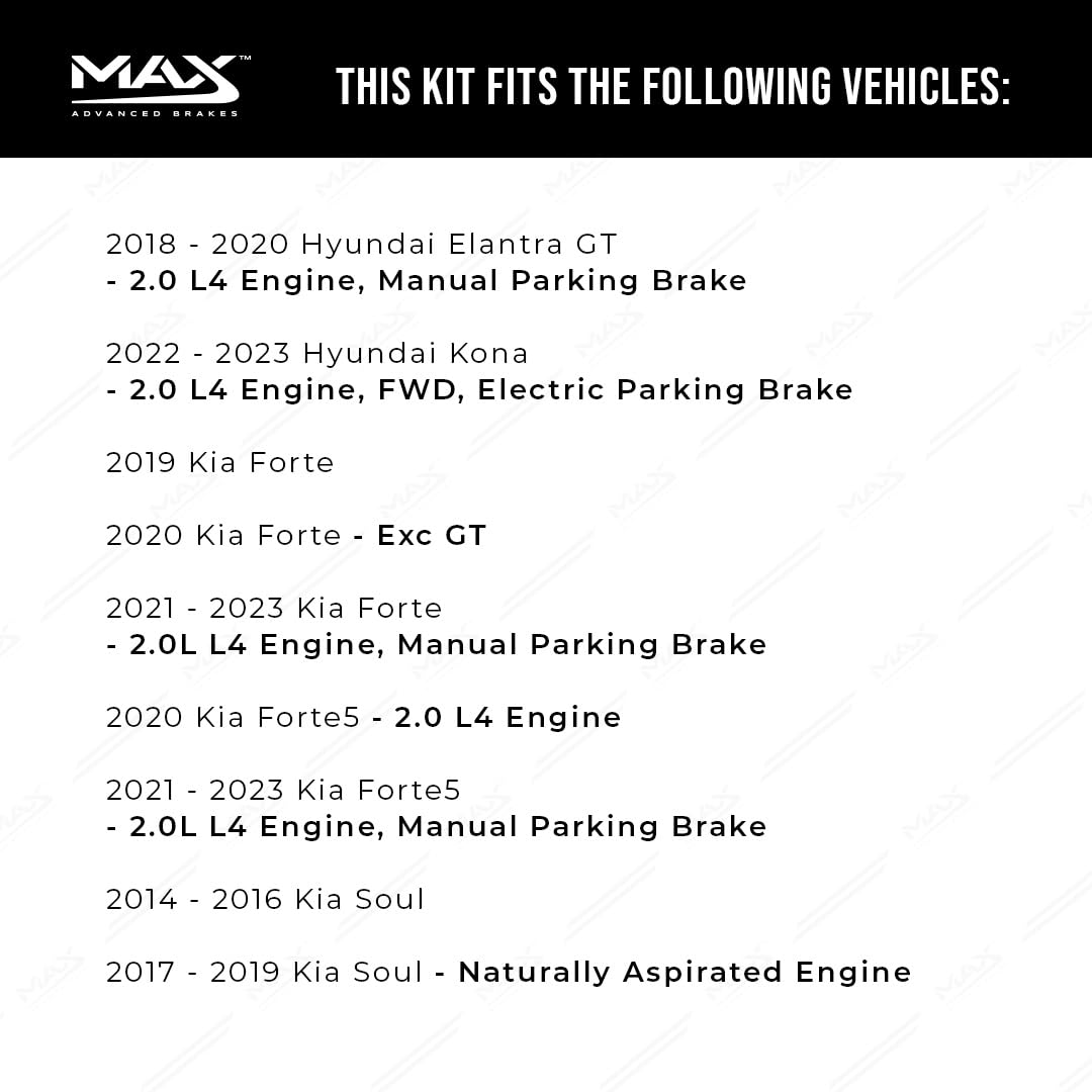 Q: What vehicles are compatible with the Max Advanced Brakes Front & Rear Brake Kit?A: The Max Advanced Brakes Front & Rear Brake Kit is specifically designed for the 2018-2020 Hyundai Elantra GT, 2019-2021 Kia Forte, and 2014-2019 Kia Soul. To ensure a perfect fit, it's essential to verify your vehicle's details including Year, Model, Sub-Model, and Engine Size during the ordering process.