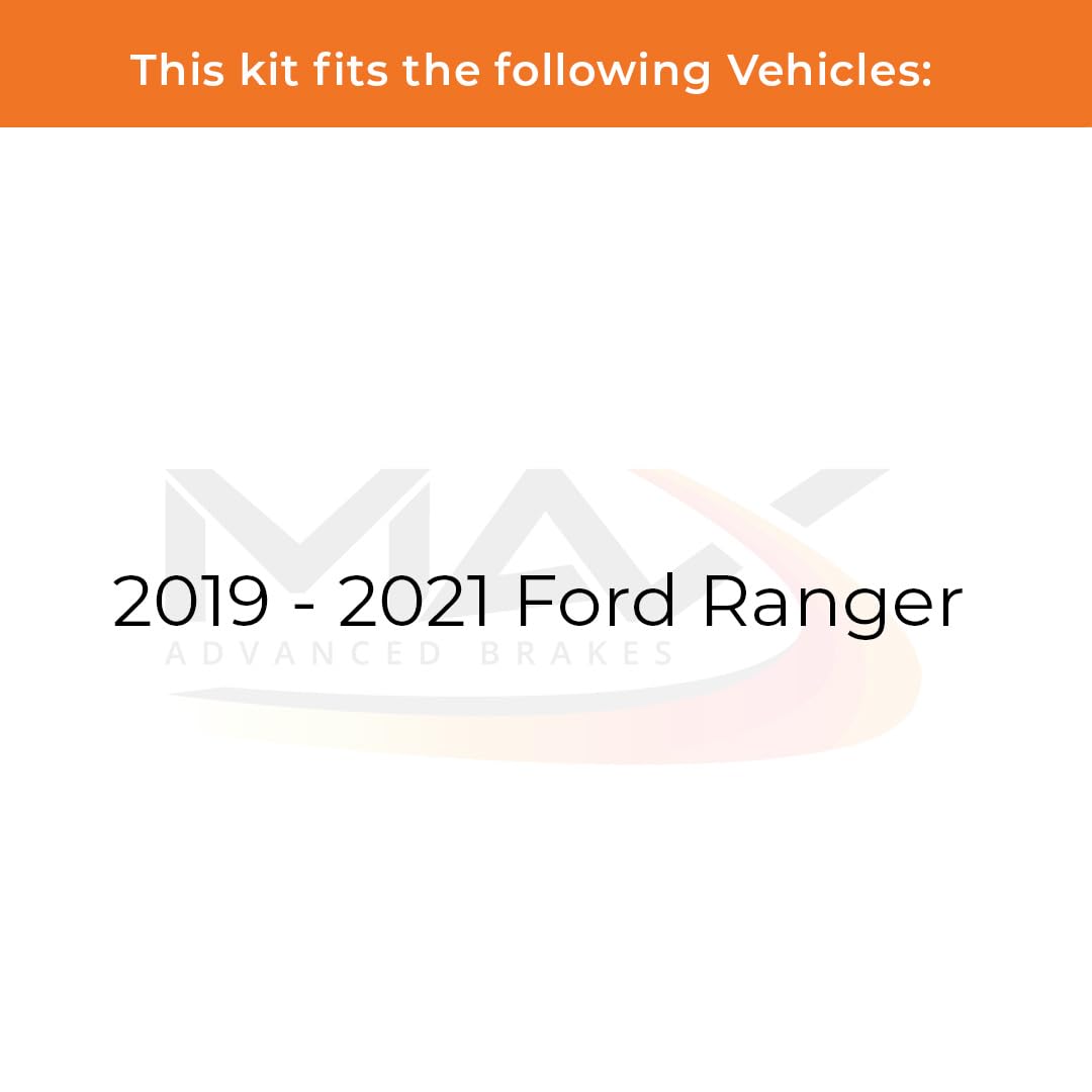 Q: What vehicles are compatible with the Max Advanced Brakes Front & Rear Brake Kit?A: The Max Advanced Brakes Front & Rear Brake Kit is specifically designed to fit 2019, 2020, and 2021 Ford Ranger models. To ensure a perfect fit, customers should verify their vehicle's specifications, including Year, Model, Sub-Model, Engine Size, and other details.
