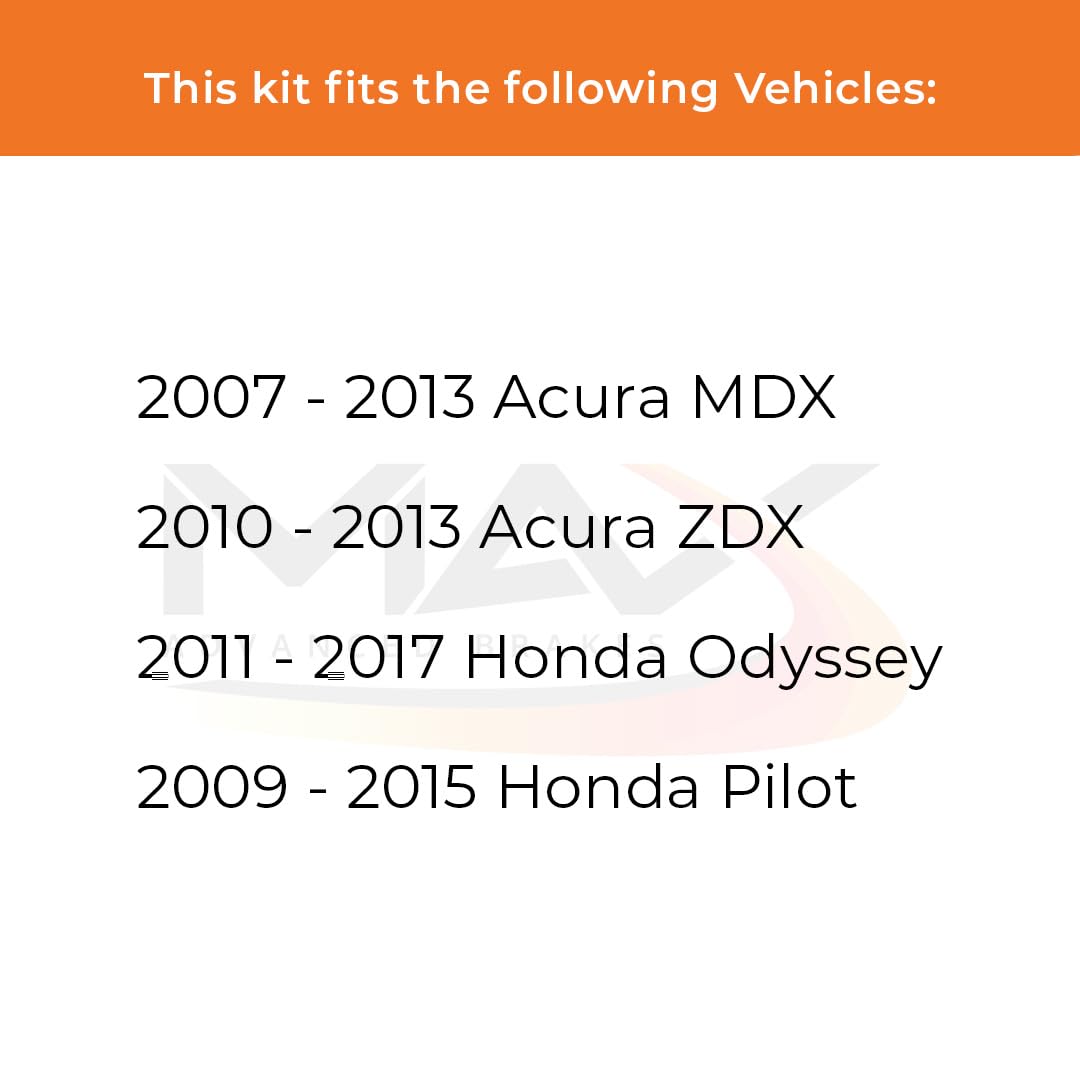 Q: What vehicles are compatible with the Max Advanced Brakes Rear Brake Kit?A: The Max Advanced Brakes Rear Brake Kit is specifically designed to fit a variety of vehicles including the 2007-2013 Acura MDX and ZDX, as well as the 2009-2017 Honda Odyssey and Pilot. Always verify your vehicle's specifications such as Year, Model, and Engine Size before ordering to ensure compatibility.