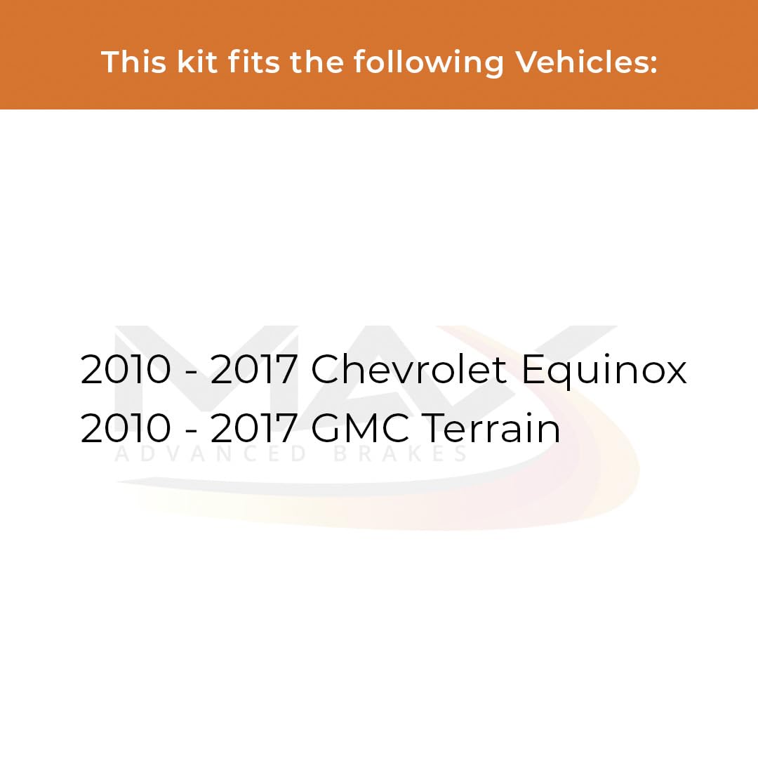 Q: What vehicles are compatible with the Max Advanced Brakes Rear Brake Kit?A: The Max Advanced Brakes Rear Brake Kit is designed to fit 2010 to 2017 Chevrolet Equinox and GMC Terrain models. To ensure a perfect fit, please verify your vehicle's Year, Model, Sub-Model, Engine Size, and other specifications before ordering.