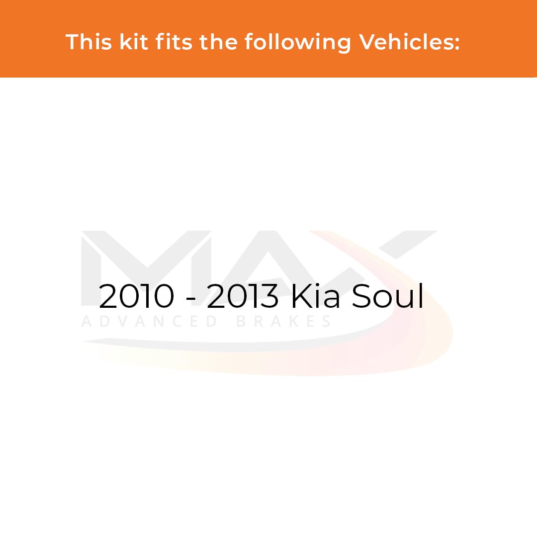 Q: What vehicles are compatible with the Max Advanced Brakes Rear Brake Kit?A: The Max Advanced Brakes Rear Brake Kit is specifically designed for the 2010, 2011, 2012, and 2013 Kia Soul. To ensure a perfect fit, please verify your vehicle's details, including Year, Model, and Engine Size before purchasing.