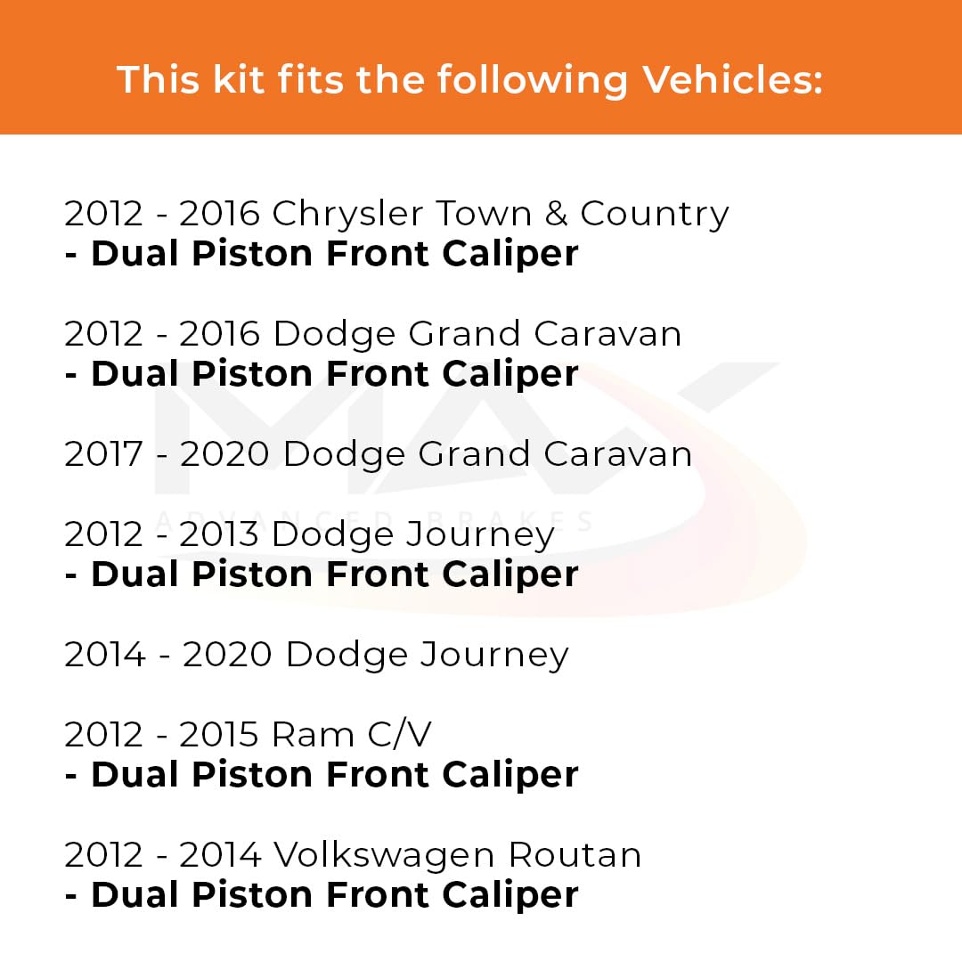 Q: What vehicles are compatible with the Max Advanced Brakes Rear Brake Kit?A: The Max Advanced Brakes Rear Brake Kit is designed to fit 2012-2020 Dodge Grand Caravan and Chrysler Town & Country models with a dual piston front caliper, as well as various models of the Dodge Journey and Ram C/V. Always verify your vehicle's specifications for optimal fitment.