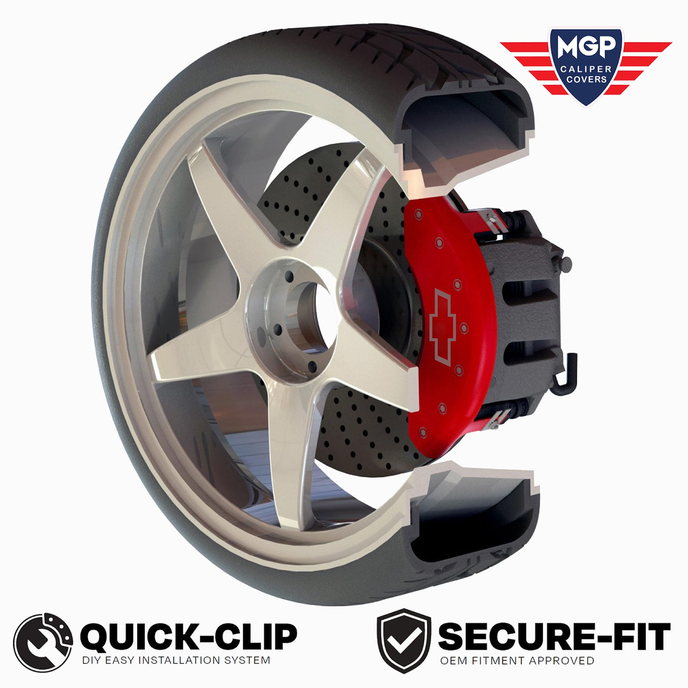 Q: How do I install MGP Brake Caliper Covers?A: MGP Brake Caliper Covers feature a patented snap-on installation system, allowing for a quick and easy installation without the need for adhesives or modifications. Most users can complete the installation in less than 1 hour.