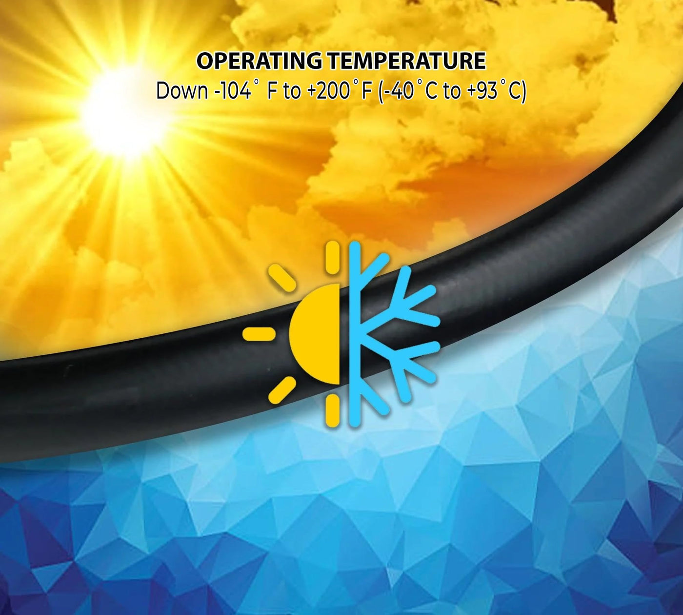Q: What is the operating temperature range for the Mytee air hose?A: The Mytee air hose is designed to operate in extreme temperatures, maintaining flexibility from -104˚F to +200˚F (-40˚C to +93˚C), making it suitable for cold weather conditions.