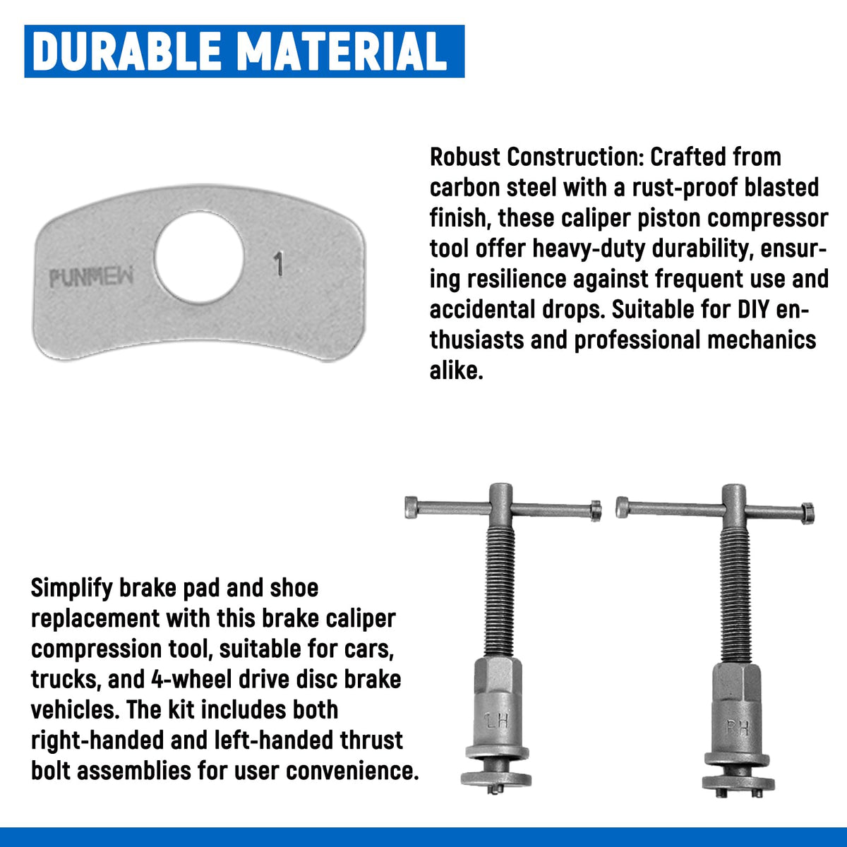 Q: What materials are used in the construction of this brake caliper tool?A: The Punmew Brake Caliper Compression Tool is crafted from durable carbon steel, featuring a rust-proof blasted finish that ensures heavy-duty durability and resilience against frequent use and accidental drops.