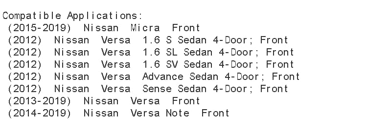 Q: What vehicles are compatible with the R1 Concepts Front Brakes and Rotors Kit?A: The R1 Concepts Front Brakes and Rotors Kit is compatible with the 2012-2019 Nissan Versa, the 2014-2019 Nissan Versa Note, and the 2015-2019 Nissan Micra. It fits various trims including the Nissan Versa 1.6 S, SL, SV, Advance, and Sense Sedan models.
