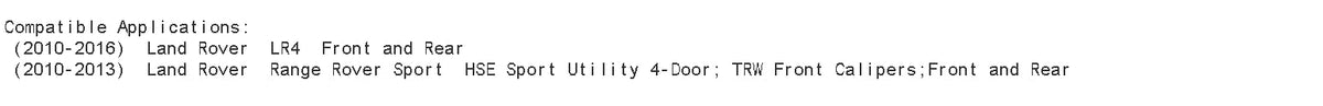 Compatible Applications for:(2010-2016) Land Rover LR4 Front and Rear(2010-2013) Land Rover Range Rover Sport HSE Sport Utility 4-Door; TRW Front Calipers;Front and Rear