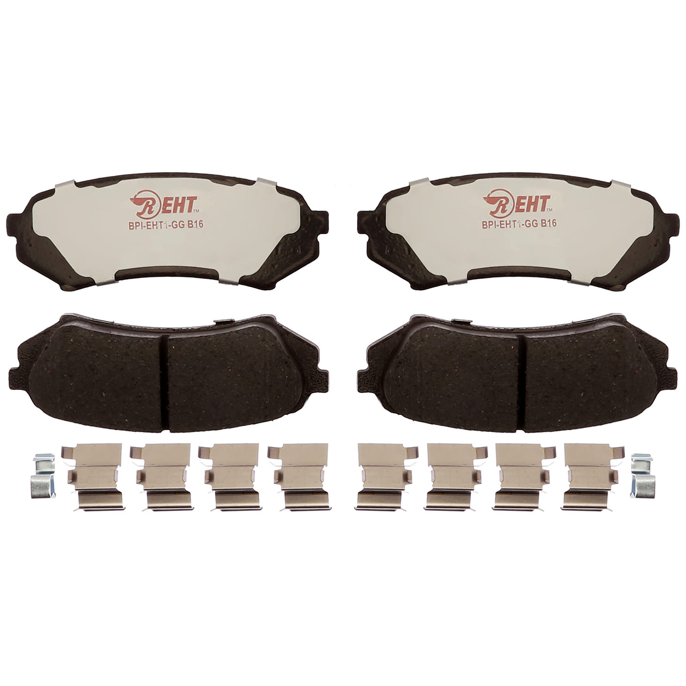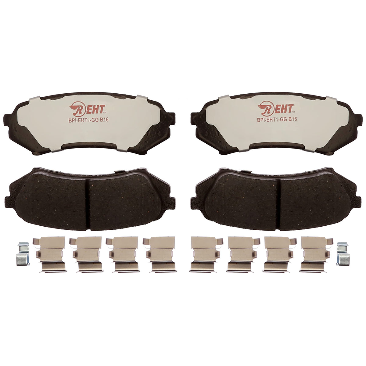 Q: What are the benefits of Enhanced Hybrid Technology in these brake pads?A: Enhanced Hybrid Technology combines the best features of ceramic and semi-metallic materials, providing improved stopping power during aggressive braking (20-25% better) and enhanced pad wear and durability (35% longer-lasting).