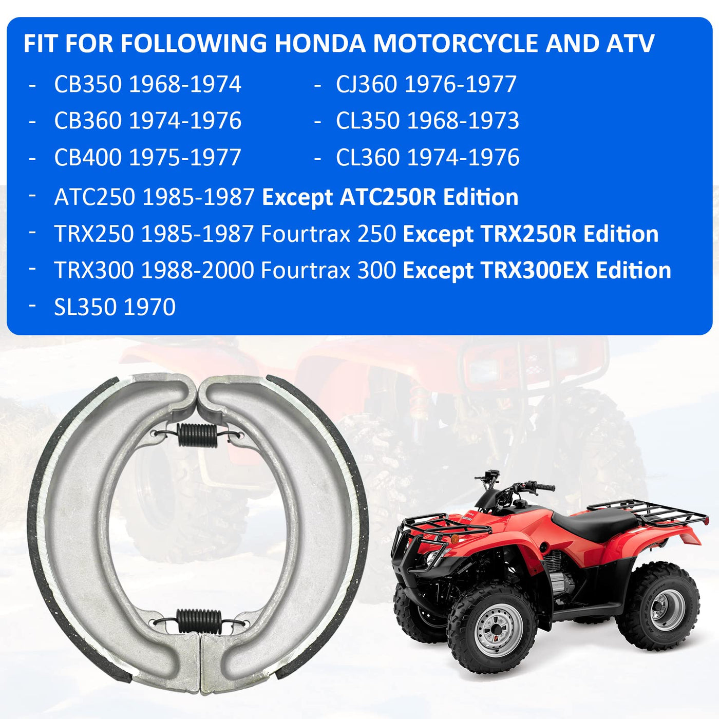 Q: What motorcycles and ATVs are compatible with the Rear Brake Shoes?A: The Rear Brake Shoes are compatible with a range of Honda models, including the TRX300 (1988-2000 Fourtrax 300), TRX250 (1985-1987 Fourtrax 250), CB350 (1968-1974), CB360 (1974-1976), CB400 (1975-1977), CJ360 (1976-1977), CL350 (1968-1973), CL360 (1974-1976), ATC250 (1985-1987 except ATC250R Edition), and SL350 (1970).