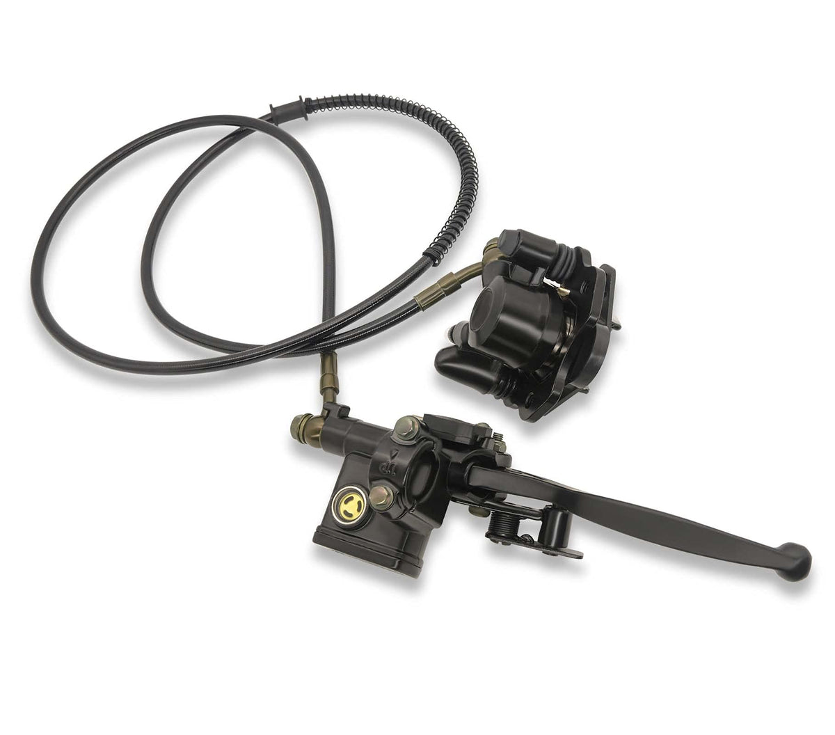 Rear Hand Hydraulic Disc Brake Left Hydraulic Brake Master Caliper Assembly Compatible for Chinese Taotao Roketa Sunl 50cc 90cc 110ccc 125cc Go-Kart Dune Buggy Quad ATV Dirt Mini Bike Kinroad Mounting Hole: 7/8inch(22mm) Caliper Distance between hole to hole: 2.5in/63mm Dimension Brake Hose Length: 59in(1500mm) Brake Lever Length:7.8in/200mm This mini bike hydraulic brake fit models: 50cc, 70cc 90cc 110cc 125cc ATVs. Package Include:1 x Rear hydraulic disc brake system caliper