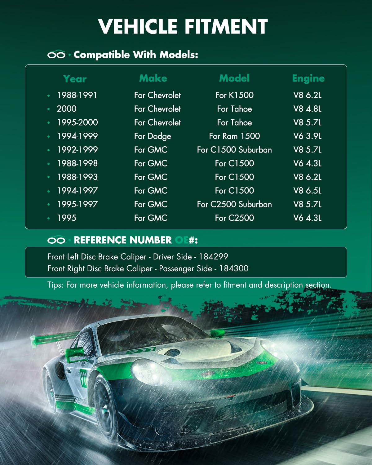 Specification:Placement on Vehicle: Front Left and Right (Driver and Passenger Side)Brake Calipers:Bracket: withoutInlet Port Size: M10 x 1.5Bleeder Port Size: M10 x 1.5Piston Size: 2.935inchBrake Piston Count: 1 PistonPiston Material: MetalCaliper Finish: Red SprayInterchange Part Number:Front Left Disc Brake Caliper - Driver Side - 184300Front Right Disc Brake Caliper - Passenger Side - 184299Package Includes: 2 x Brake CalipersCompatible with:(For More Details, Please Check ''FITMENT'' in the Upper Left Corner)For Cadillac Commercial Chassis 1991-1992For Cadillac DeVille 1990-1993 1998-1999For Cadillac Escalade 1999-2000For Cadillac Fleetwood 1990-1992For Chevrolet Astro 1990-2002For Chevrolet Blazer 1992-1994For Chevrolet C1500 1988-1999For Chevrolet Express 1500 1996-2002For Chevrolet Express 2500 1996-1997 1999-2002For Chevrolet K1500 1988-1999For Chevrolet Suburban 1500 2000For Chevrolet Tahoe 1995-2000For Dodge Ram 1500 1994-1999For GMC Safari 1990-2002For GMC Savana 1500 1996-2002For GMC Savana 2500 1996-2001For GMC Yukon 1992-2000