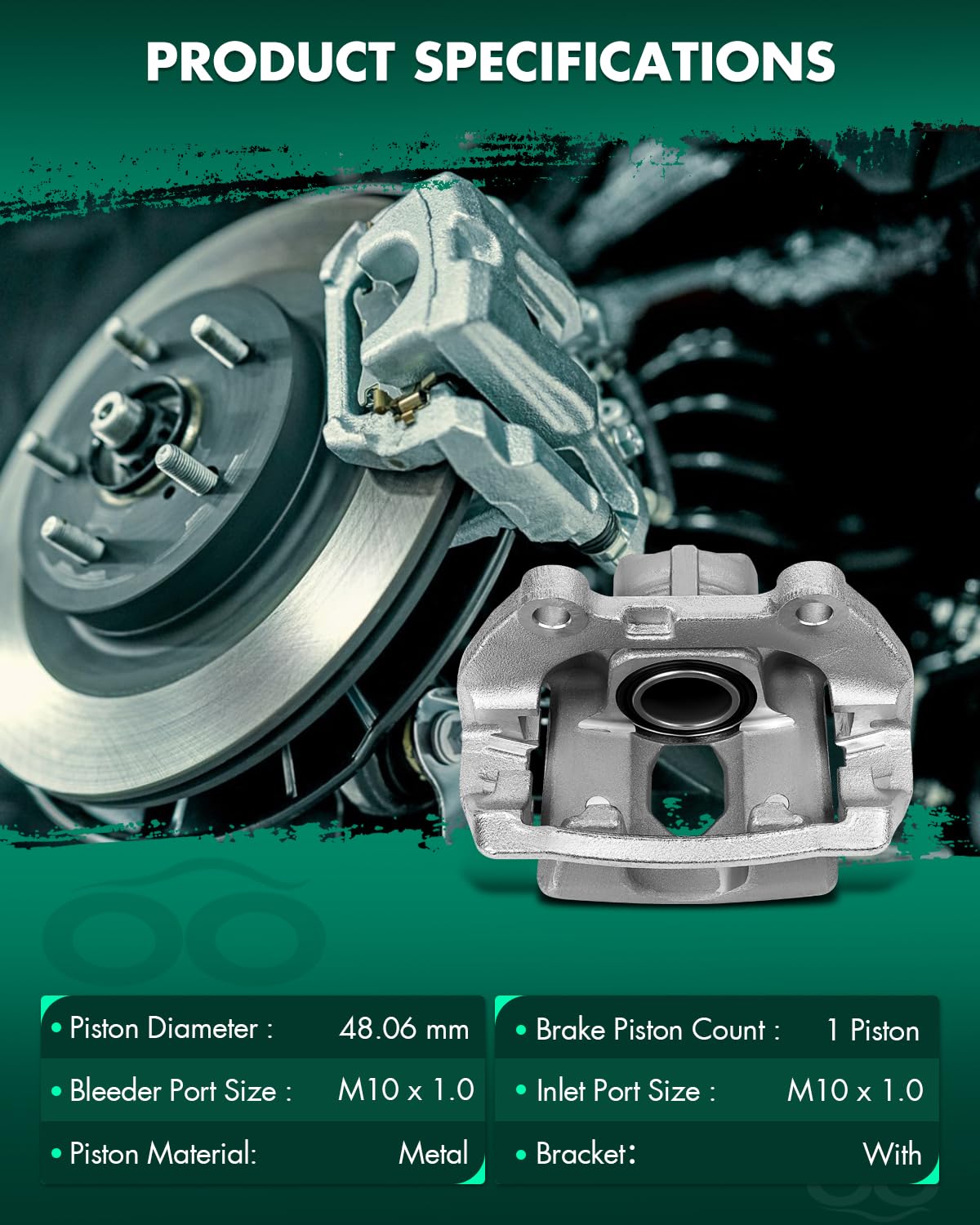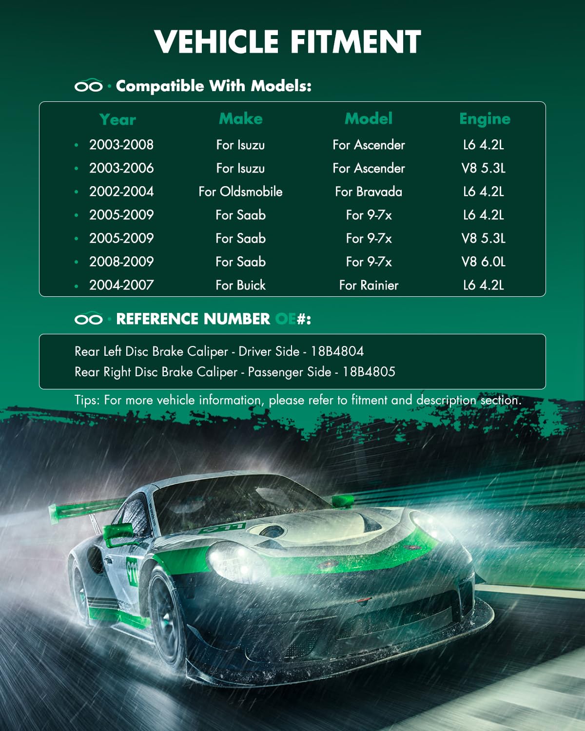 Specification:Placement on Vehicle: Rear Left and Right (Driver and Passenger Side)Brake Calipers:Bracket: withInlet Port Size: M10 x 1.0Bleeder Port Size: M10 x 1.0Piston Size: 1.892inchBrake Piston Count: 1 PistonPiston Material: MetalCaliper Finish: Oxygen OxidationInterchange Part Number:Rear Left Disc Brake Caliper - Driver Side - 18B4804Rear Right Disc Brake Caliper - Passenger Side - 18B4805Package Includes: 2 x Brake CalipersCompatible with:(For More Details, Please Check ''FITMENT'' in the Upper Left Corner)For Buick 2004-2007For Chevrolet 2002-2009For GMC 2002-2009For Isuzu 2003-2008