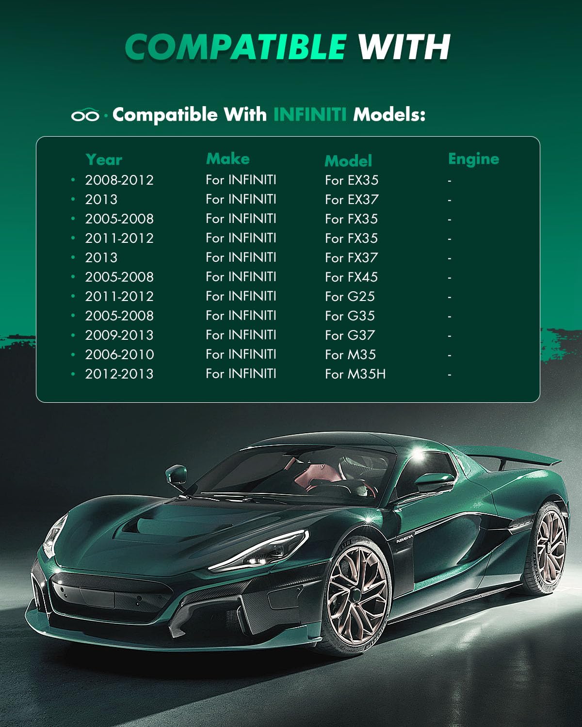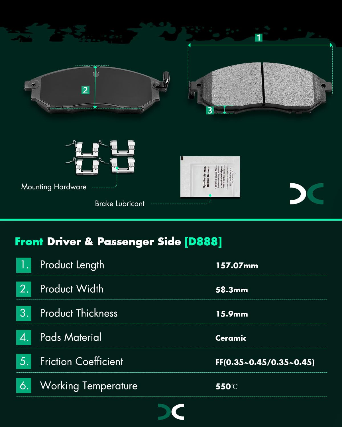 Compatibility Information2005-2008 for Infiniti FX35 Base Sport Utility 4-Door2007-2008 for Infiniti FX45 Base Sport Utility 4-Door2005-2007 for Infiniti G35 Base Coupe 2-Door2005-2006 for Infiniti G35 Base Sedan 4-Door2006 for Infiniti G35 X Sedan 4-Door2006-2009 for Infiniti M35 Base Sedan 4-Door2006-2007 for Infiniti M35 Sport Sedan 4-Door2006-2009 for Infiniti M35 X Sedan 4-Door2006-2009 for Infiniti M45 Base Sedan 4-Door2006-2007 for Infiniti M45 Sport Sedan 4-Door2008-2009 for Infiniti M45 X Sedan 4-Door2006 for Nissan 350Z Base Convertible 2-Door2006-2008 for Nissan 350Z Base Coupe 2-Door2006-2009 for Nissan 350Z Enthusiast Convertible 2-Door2006-2008 for Nissan 350Z Enthusiast Coupe 2-Door2006-2009 for Nissan 350Z Touring Convertible 2-Door2006-2008 for Nissan 350Z Touring Coupe 2-DoorSpecifications:Placement on Vehicle: Front, Rear, Left, RightBrake Pad Compound: CeramicPart Number:ATD888C ATD905CPackage Including:8pcs ceramic brake pads