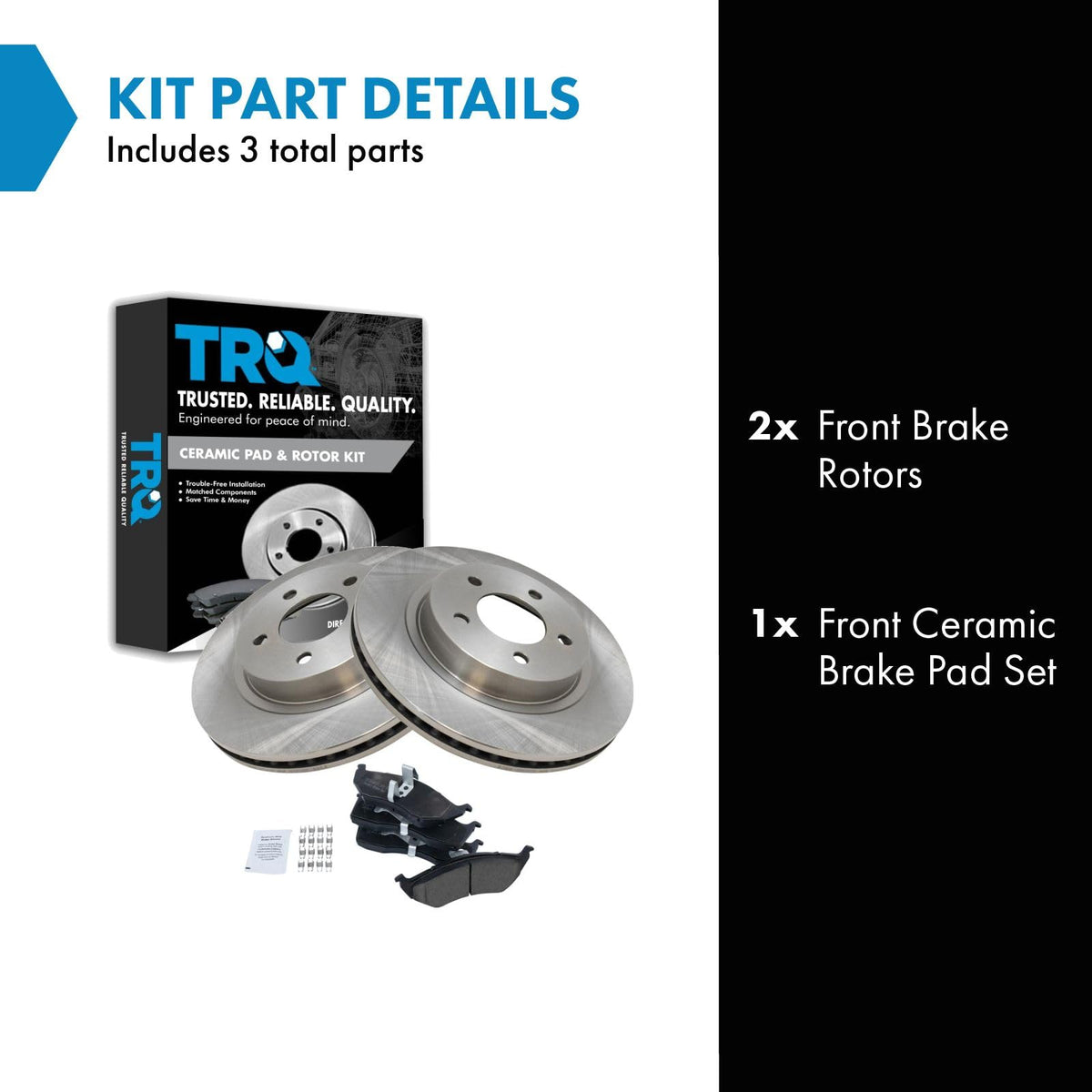 Ceramic Brake Pad & Rotor KitKit Includes(1) Front Ceramic Brake Pad Set(2) Front Brake RotorsFitmentCompatible with: 1999-04 Chrysler 300M FrontCompatible with: 2000-04 Chrysler Concorde Front with 16 Inch WheelsCompatible with: 2001-02 Dodge Intrepid SE Front with 16 Inch WheelsCompatible with: 2003-04 Dodge Intrepid FrontCompatible with: 1999-01 Chrysler LHS FrontCompatible with: 2000 Dodge Intrepid Base Model Front with 16 Inch WheelsCompatible with: 1998-99 Dodge Intrepid Front with 16 Inch WheelsCompatible with: 1998-99 Chrysler Concorde FrontProduct AttributesFront Brake Rotor Diameter: 11.69 in. (297mm)Wheel Lug Count: 5 LugBrake Pad Friction Material: CeramicBrake Pad Bonding Type: Premium PosiFront Brake Rotor Venting Type: VentedProduct Features Positive Molded - Less dust resulting in clean wheels G3000 Casting Alloy - Reduced noise and improved wear resistance Application Specific Design - Extended service life, no modificationsItem DetailsTRQ brake kits are designed to restore your brake system to like-new performance. TRQ brake pads are positive molded, thermal scorched, chamfered, and utilize a multi-layer shim for enhanced performance and service life. TRQ rotors have a non-directional finish that reduces the break-in period for new rotors as well as reducing vibrations throughout the rotors lifecycle. All products are fit and road-tested in our Massachusetts R&D facility to ensure we deliver on our promise of Trusted Reliable Quality.Reference NumbersAimco: 5386Auto Extra: AXCD730CBendix: PRT5198Chrysler: 04897664AA, 04897665AA, 05010034AA, 05010034AB, 05011743AA, 05018595AA, 05086167AADodge: 05010034AA, 05010034AB, 05011743AA, 05014438AA, 05086167AADuraGo: BR5386Hollander: 530-02022Plymouth: 04897664AA, 04897665AA, 05014438AARaybestos Brakes: 76722, 76722FZN, 76722P, 76722R, EHT730H, MGD730CH, SGD730CWagner: BD125638