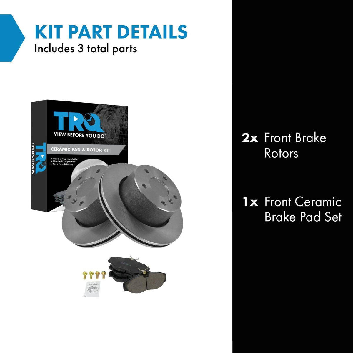 Ceramic Brake Pad & Rotor KitKit Includes(1) Front Ceramic Brake Pad Set(2) Front Brake RotorsFitmentCompatible with: 2000-04 Land Rover Discovery FrontCompatible with: 1999 Land Rover Discovery Series II FrontProduct AttributesBrake Pad Friction Material: CeramicBrake Pad Bonding Type: Premium PosiProduct Features Positive Molded - Less dust resulting in clean wheels G3000 Casting Alloy - Reduced noise and improved wear resistance Application Specific Design - Extended service life, no modificationsItem DetailsTRQ brake kits are designed to restore your brake system to like-new performance. TRQ brake pads are positive molded, thermal scorched, chamfered, and utilize a multi-layer shim for enhanced performance and service life. TRQ rotors have a non-directional finish that reduces the break-in period for new rotors as well as reducing vibrations throughout the rotors lifecycle. All products are fit and road-tested in our Massachusetts R&D facility to ensure we deliver on our promise of Trusted Reliable Quality.Reference NumbersAimco: 34253Bendix: PRT5577DuraGo: BR34253Land Rover: SFP000210, SFP100460, SFP100480, STC1880, STC3195Raybestos Brakes: 980273, 980273FZN, 980273P, 980273R, PGD676MWagner: BD126319