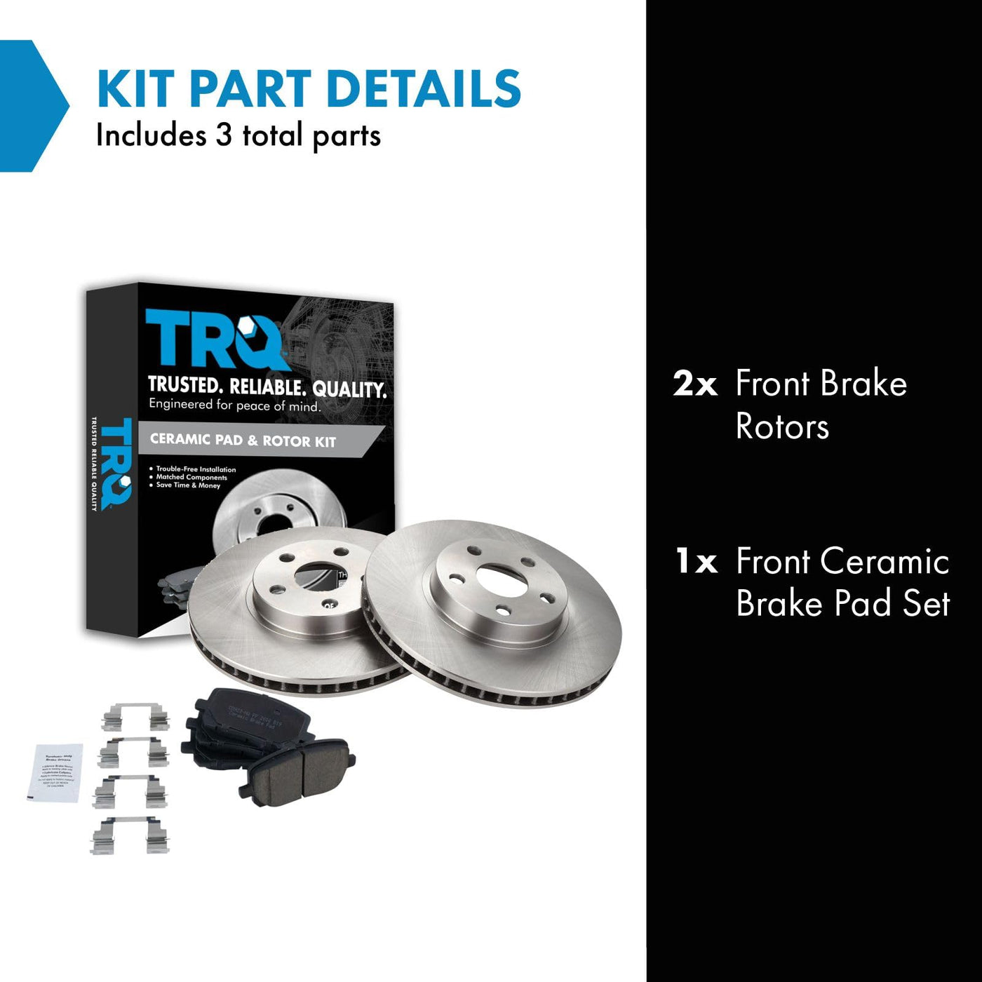 Ceramic Brake Pad & Rotor KitKit Includes(1) Front Ceramic Brake Pad Set(2) Front Brake RotorsFitmentCompatible with: 2003-08 Toyota Corolla FrontCompatible with: 2003-08 Toyota Matrix FrontCompatible with: 2003-08 Pontiac Vibe FrontProduct AttributesFront Brake Rotor Diameter: 10.83 in. (275mm)Wheel Lug Count: 5 LugBrake Pad Friction Material: CeramicBrake Pad Bonding Type: Premium PosiFront Brake Rotor Venting Type: VentedProduct Features Positive Molded - Less dust resulting in clean wheels G3000 Casting Alloy - Reduced noise and improved wear resistance Application Specific Design - Extended service life, no modificationsItem DetailsTRQ brake kits are designed to restore your brake system to like-new performance. TRQ brake pads are positive molded, thermal scorched, chamfered, and utilize a multi-layer shim for enhanced performance and service life. TRQ rotors have a non-directional finish that reduces the break-in period for new rotors as well as reducing vibrations throughout the rotors lifecycle. All products are fit and road-tested in our Massachusetts R&D facility to ensure we deliver on our promise of Trusted Reliable Quality.Reference NumbersAimco: 31270Bendix: PRT5294DuraGo: BR31270Pontiac: 88972092, 88972096Raybestos Brakes: 96934, 96934FZN, 96934P, 96934R, EHT923H, MGD923CH, SGD923CToyota: 446502070, 446502080Wagner: BD126017