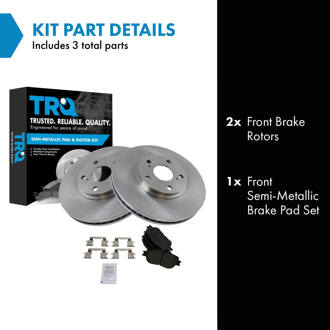 Semi-Metallic Brake Pad & Rotor KitKit Includes(1) Front Semi-Metallic Brake Pad Set(2) Front Brake RotorsFitmentCompatible with: 2002-04 Toyota Camry SE Front with Stepped Hat RotorsCompatible with: 2002-04 Toyota Camry XLE Front with Stepped Hat RotorsProduct AttributesBrake Pad Friction Material: Semi-MetallicProduct Features Positive Molded - Less dust resulting in clean wheels G3000 Casting Alloy - Reduced noise and improved wear resistance Application Specific Design - Extended service life, no modificationsItem DetailsTRQ brake kits are designed to restore your brake system to like-new performance. TRQ brake pads are positive molded, thermal scorched, chamfered, and utilize a multi-layer shim for enhanced performance and service life. TRQ rotors have a non-directional finish that reduces the break-in period for new rotors as well as reducing vibrations throughout the rotors lifecycle. All products are fit and road-tested in our Massachusetts R&D facility to ensure we deliver on our promise of Trusted Reliable Quality.Reference NumbersAimco: 31266Bendix: PRT5324DuraGo: BR31266Hollander: 530-58918, 530-58942Lexus: 446530340Raybestos Brakes: 96820, 96820FZN, 96820P, 96820R, EHT908HToyota: 446533240Wagner: BD125731