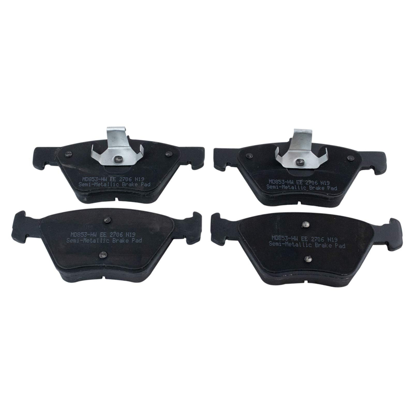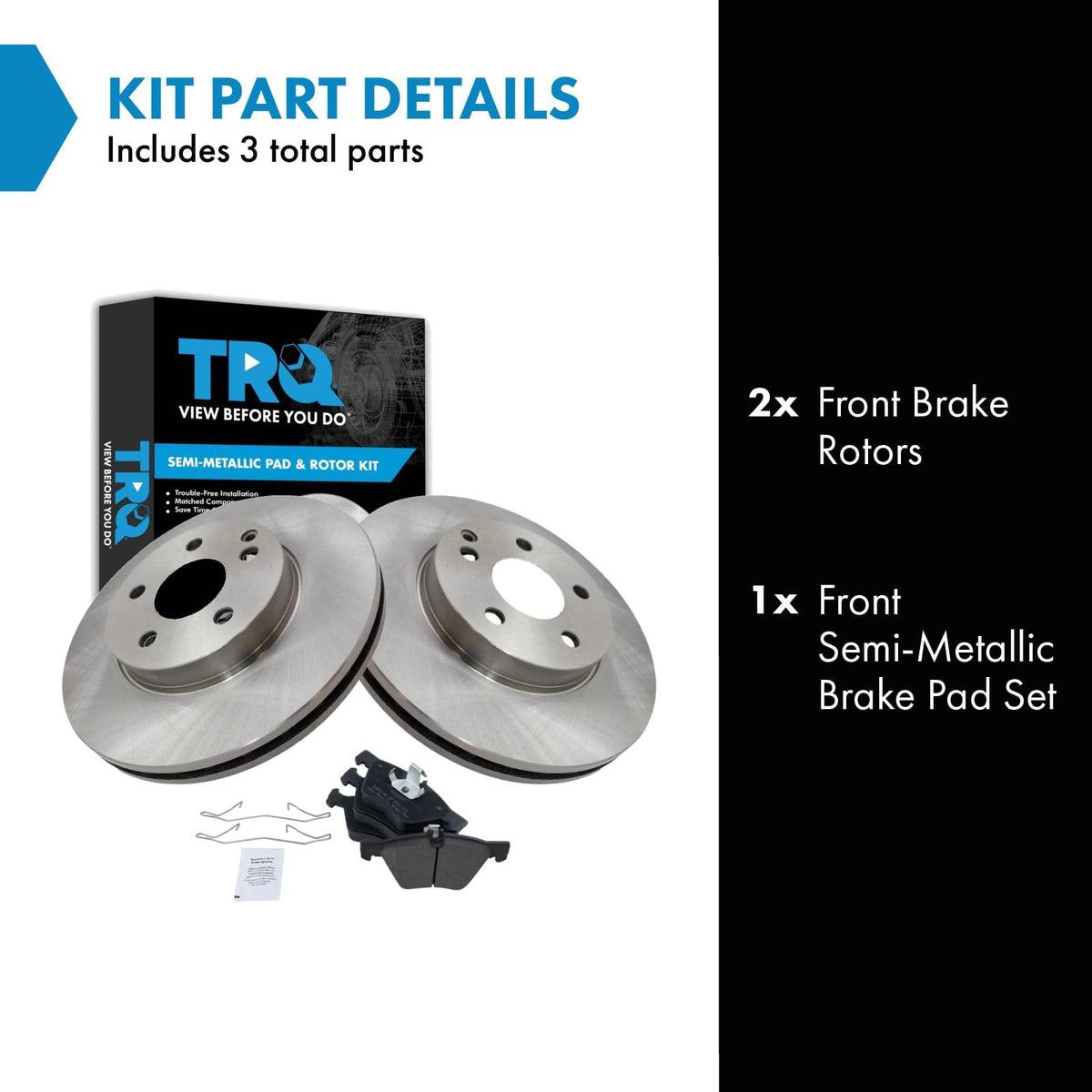 Semi-Metallic Brake Pad & Rotor KitKit Includes(1) Front Semi-Metallic Brake Pad Set(2) Front Brake RotorsFitmentCompatible with: 2006-09 Mercedes Benz E350 All Wheel Drive Front without Sport PackageCompatible with: 2003 Mercedes Benz E320 Base Model Wagon FrontProduct AttributesBrake Pad Friction Material: Semi-MetallicProduct Features Positive Molded - Less dust resulting in clean wheels G3000 Casting Alloy - Reduced noise and improved wear resistance Application Specific Design - Extended service life, no modificationsItem DetailsTRQ brake kits are designed to restore your brake system to like-new performance. TRQ brake pads are positive molded, thermal scorched, chamfered, and utilize a multi-layer shim for enhanced performance and service life. TRQ rotors have a non-directional finish that reduces the break-in period for new rotors as well as reducing vibrations throughout the rotors lifecycle. All products are fit and road-tested in our Massachusetts R&D facility to ensure we deliver on our promise of Trusted Reliable Quality.Reference NumbersAimco: 34233Auto Extra: AXMD853Bendix: PRT5483Chrysler: 05114555AA, 05139218AADuraGo: BR900616Mercedes-Benz: 34202920, 44200320, 44200720Raybestos Brakes: 980222, 980222FZN, 980222P, 980222R, PGD853MWagner: BD180133