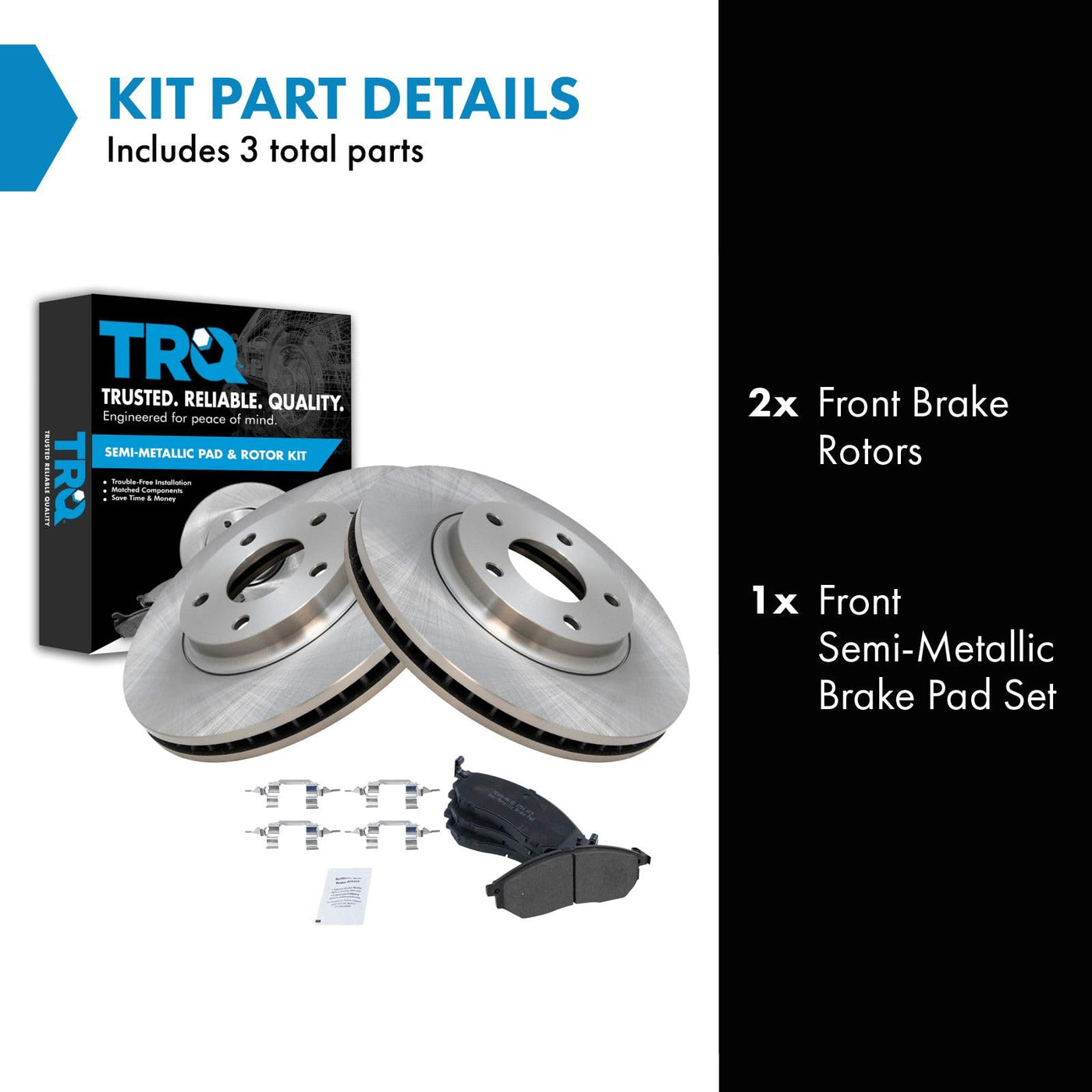 Semi-Metallic Brake Pad & Rotor KitKit Includes(1) Front Semi-Metallic Brake Pad Set(2) Front Brake RotorsFitmentCompatible with: 2002-06 Infiniti Q45 FrontCompatible with: 2003-04 Infiniti M45 FrontProduct AttributesFront Brake Rotor Diameter: 11.42 in. (290mm)Wheel Lug Count: 5 LugBrake Pad Bonding Type: Premium PosiBrake Pad Friction Material: Semi-MetallicFront Brake Rotor Venting Type: VentedProduct Features Positive Molded - Less dust resulting in clean wheels G3000 Casting Alloy - Reduced noise and improved wear resistance Application Specific Design - Extended service life, no modificationsItem DetailsTRQ brake kits are designed to restore your brake system to like-new performance. TRQ brake pads are positive molded, thermal scorched, chamfered, and utilize a multi-layer shim for enhanced performance and service life. TRQ rotors have a non-directional finish that reduces the break-in period for new rotors as well as reducing vibrations throughout the rotors lifecycle. All products are fit and road-tested in our Massachusetts R&D facility to ensure we deliver on our promise of Trusted Reliable Quality.Reference NumbersAimco: 31389Bendix: PRT5673DIY Solutions: BFS00339DuraGo: BR900408INFINITI: 41060AR090, 41060AT30J, 41060EG090, D10601NC0A, D10601NC0B, D10601NC0C, D1060EG51A, D1060EJ20ANissan: 41060EG090, D10601NC0A, D10601NC0B, D10601NC0C, D1060EG51A, D1060EJ20A, D1060ZS60ARaybestos Brakes: 980116, 980116FZN, 980116P, 980116PER, 980116R, EHT888HRenault: 410600023R, 410603072RWagner: BD126096