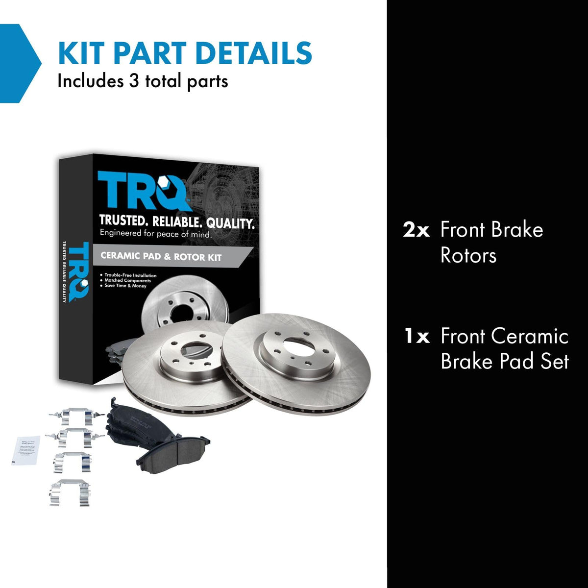 Ceramic Brake Pad & Rotor KitKit Includes(1) Front Ceramic Brake Pad Set(2) Front Brake RotorsFitmentCompatible with: 2011-13 Infiniti G37 X Sedan Front without Brembo brakes without Sport PackageCompatible with: 2011-13 Infiniti G37 Journey Sedan Front without Brembo brakes without Sport PackageCompatible with: 2011-12 Nissan Murano CrossCabriolet FrontCompatible with: 2013-14 Nissan Murano FrontCompatible with: 2006-07 Infiniti G35 Front without Sport PackageCompatible with: 2009-10 Infiniti G37 X Sedan Front without Sport PackageCompatible with: 2009-10 Infiniti G37 Base Model Sedan Front without Sport PackageCompatible with: 2009-10 Infiniti G37 Journey Sedan Front without Sport PackageCompatible with: 2006-10 Infiniti M35 FrontCompatible with: 2006-09 Nissan 350Z Enthusiast Front with Dual Piston Front CalipersCompatible with: 2006-08 Nissan 350Z Base Model Front with Dual Piston Front Calipers with Touring PackageCompatible with: 2008 Infiniti G35 Front without Brembo brakes without Sport PackageCompatible with: 2005 Infiniti G35 Rear Wheel Drive FrontCompatible with: 2009-13 Nissan 370Z Front with Dual Piston Front Calipers without Sport PackageCompatible with: 2008-12 Infiniti EX35 FrontCompatible with: 2011-13 Infiniti M37 X FrontCompatible with: 2011-13 Infiniti M37 Base Model Front without Sport PackageCompatible with: 2015-19 Nissan 370Z Touring FrontCompatible with: 2015-19 Nissan 370Z Base Model FrontCompatible with: 2015-17 Infiniti QX70 FrontCompatible with: 2011-12 Infiniti G25 FrontCompatible with: 2014-19 Infiniti Q70 Front with Dual Piston Front Calipers without Sport PackageCompatible with: 2015-19 Infiniti Q70L Front without Sport PackageCompatible with: 2015 Infiniti Q40 FrontCompatible with: 2006-10 Infiniti M45 FrontCompatible with: 2014 Nissan 370Z Touring Front without Sport PackageCompatible with: 2014 Nissan 370Z Base Model Front without Sport PackageCompatible with: 2014-15 Infiniti QX50 FrontCompatible with: 2014 Infiniti QX70 V6 3.7L From 9/01/13 Production Date FrontCompatible with: 2011-13 Infiniti M56 Front without Sport PackageCompatible with: 2013 Infiniti EX37 FrontCompatible with: 2012-13 Infiniti M35h FrontCompatible with: 2005 Infiniti FX45 To 10/31/05 Production Date FrontProduct AttributesFront Brake Rotor Diameter: 12.56 in. (319mm)Wheel Lug Count: 5 LugBrake Pad Friction Material: CeramicBrake Pad Bonding Type: Premium PosiFront Brake Rotor Venting Type: VentedProduct Features Positive Molded - Less dust resulting in clean wheels G3000 Casting Alloy - Reduced noise and improved wear resistance Application Specific Design - Extended service life, no modificationsItem DetailsTRQ brake kits are designed to restore your brake system to like-new performance. TRQ brake pads are positive molded, thermal scorched, chamfered, and utilize a multi-layer shim for enhanced performance and service life. TRQ rotors have a non-directional finish that reduces the break-in period for new rotors as well as reducing vibrations throughout the rotors lifecycle. All products are fit and road-tested in our Massachusetts R&D facility to ensure we deliver on our promise of Trusted Reliable Quality.Reference NumbersAimco: 31341, 31375Bendix: PRT5506, PRT5611DuraGo: BR31341, BR31375Hollander: 530-58991INFINITI: 41060AR090, 41060AT30J, 41060EG090, D10601NC0A, D10601NC0B, D10601NC0C, D1060EG51A, D1060EJ20ANissan: 41060EG090, D10601NC0A, D10601NC0B, D10601NC0C, D1060EG51A, D1060EJ20A, D1060ZS60ARaybestos Brakes: 980156, 980156FZN, 980156P, 980156R, 980307, 980307FZN, 980307P, 980307PER, 980307R, EHT888H, MGD888CH, PGD888CRenault: 410600023R, 410603072RWagner: BD126097, BD126593