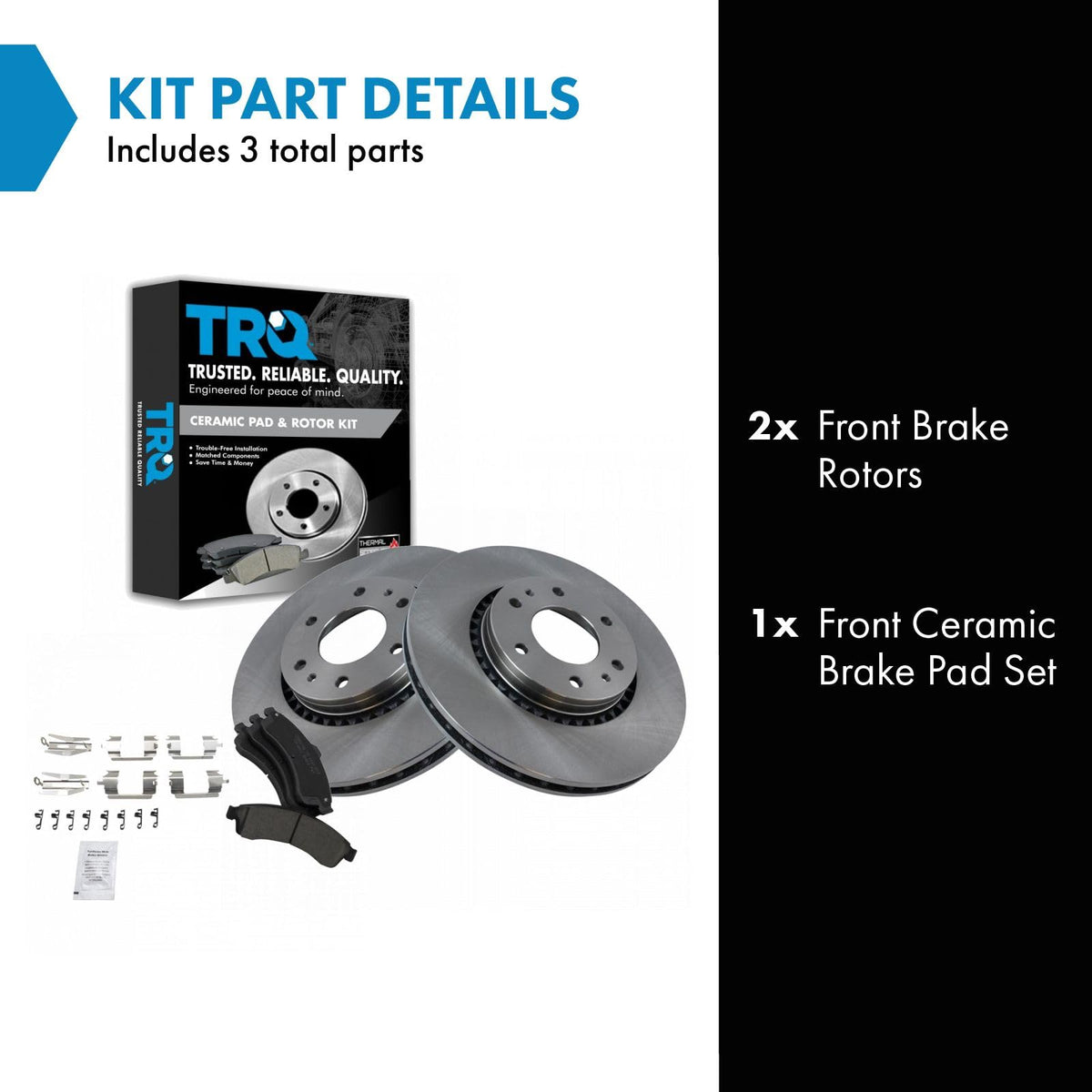 Ceramic Brake Pad & Rotor KitKit Includes(1) Front Ceramic Brake Pad Set(2) Front Brake RotorsFitmentCompatible with: 2002-05 Chevrolet Trailblazer EXT FrontCompatible with: 2002-05 GMC Envoy XL FrontCompatible with: 2005 GMC Envoy V8 5.3L FrontCompatible with: 2004-05 Buick Rainier with 7 Passenger Seating FrontCompatible with: 2003-05 Chevrolet SSR FrontCompatible with: 2004-05 GMC Envoy XUV FrontCompatible with: 2003-06 Isuzu Ascender V8 5.3L FrontCompatible with: 2005 Saab 9-7X FrontProduct AttributesFront Brake Rotor Diameter: 12.80 in. (325mm)Wheel Lug Count: 6 LugBrake Pad Friction Material: CeramicBrake Pad Bonding Type: Premium PosiFront Brake Rotor Venting Type: VentedProduct Features Positive Molded - Less dust resulting in clean wheels G3000 Casting Alloy - Reduced noise and improved wear resistance Application Specific Design - Extended service life, no modificationsItem DetailsTRQ brake kits are designed to restore your brake system to like-new performance. TRQ brake pads are positive molded, thermal scorched, chamfered, and utilize a multi-layer shim for enhanced performance and service life. TRQ rotors have a non-directional finish that reduces the break-in period for new rotors as well as reducing vibrations throughout the rotors lifecycle. All products are fit and road-tested in our Massachusetts R&D facility to ensure we deliver on our promise of Trusted Reliable Quality.Reference NumbersAimco: 55079Bendix: PRT5342Buick: 12497782, 88964423Chevrolet: 12497782, 88964424, 88982932DuraGo: BR55079GMC: 12497782, 88964424, 88982932Hollander: 530-02114Isuzu: 8889829320Oldsmobile: 12497782Raybestos Brakes: 580023, 580023FZN, 580023P, 580023PER, 580023R, EHT882H, MGD882CH, SGD882CSaab: 88964423Wagner: BD126028