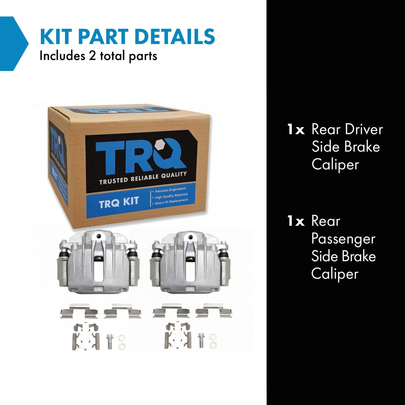 2 Piece Brake Caliper SetKit Includes(1) Rear Driver Side Brake Caliper(1) Rear Passenger Side Brake CaliperFitmentCompatible with: 1999-01 Chevrolet Silverado 1500 Rear Driver & Passenger SideCompatible with: 1999-02 GMC Sierra 1500 Rear Driver & Passenger SideCompatible with: 2002 Chevrolet Silverado 1500 with 2 Wheel Steering Rear Driver & Passenger SideCompatible with: 2000-01 Chevrolet Tahoe Rear Driver & Passenger SideCompatible with: 2000-02 Cadillac Deville with 8 Lug Wheels with RPO Code J55 Heavy Duty Brakes Rear Driver & Passenger SideCompatible with: 2000-01 GMC Yukon Rear Driver & Passenger SideCompatible with: 2003-05 Chevrolet Astro Rear Driver & Passenger SideCompatible with: 2003-05 GMC Safari Rear Driver & Passenger SideProduct AttributesQuantity: 2 PieceIncludes: BracketIncludes: HardwareProduct Features Zinc Coated: Long lasting rust prevention EPDM Seals: Enhanced resistance to thermal deterioration No Core Charge: 100% new components Hardware and Abutment Kit Included: Complete repair in a single purchase Direct Replacement: No modifications necessaryItem DetailsTRQ brake calipers are made from premium raw materials designed to restore original performance. All TRQ calipers are new, so there will never be a core charge with your TRQ purchase. TRQ brake calipers include upgraded seals, washers, abutment kits and brackets where applicable to ensure a complete repair. TRQ recommends replacing your calipers in pairs with new brake pads and brake rotors to ensure components wear evenly and avoid multiple repairs of the same system. All products are fit and road-tested in our Massachusetts R&D facility to ensure we deliver on our promise of Trusted Reliable Quality.Reference NumbersACDelco: 18FR1382, 18FR1383BBB Industries: 99-17305L-C, 99-17305R-CCARDONE Reman: 18-B4726, 18-B4727, 18-B4854, 18-B4855DFC Calipers Outright Program - Archived: 331-47698, 331-47699Nugeon: 22-17305L, 22-17305RRaybestos Brakes: FRC11035, FRC11035N, FRC11036, FRC11036NUAP: C66503, C66504UCX: 14-4374, 14-4375