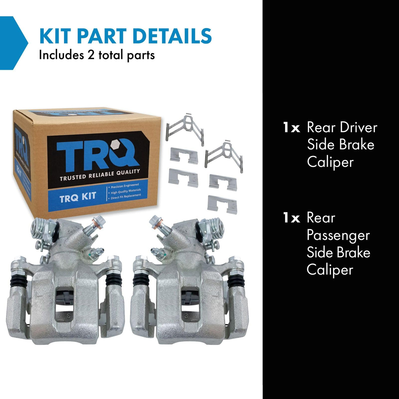 2 Piece Brake Caliper SetKit Includes(1) Rear Driver Side Brake Caliper(1) Rear Passenger Side Brake CaliperFitmentCompatible with: 2002-05 Honda Civic SI L4 2.0L Rear Driver & Passenger SideCompatible with: 2002-06 Acura RSX Rear Driver & Passenger SideProduct AttributesQuantity: 2 PieceIncludes: BracketIncludes: HardwareProduct Features Zinc Coated: Long lasting rust prevention EPDM Seals: Enhanced resistance to thermal deterioration No Core Charge: 100% new components Hardware and Abutment Kit Included: Complete repair in a single purchase Direct Replacement: No modifications necessaryItem DetailsTRQ brake calipers are made from premium raw materials designed to restore original performance. All TRQ calipers are new, so there will never be a core charge with your TRQ purchase. TRQ brake calipers include upgraded seals, washers, abutment kits and brackets where applicable to ensure a complete repair. TRQ recommends replacing your calipers in pairs with new brake pads and brake rotors to ensure components wear evenly and avoid multiple repairs of the same system. All products are fit and road-tested in our Massachusetts R&D facility to ensure we deliver on our promise of Trusted Reliable Quality.Reference NumbersACDelco: 18FR2264C, 18FR2265CBBB Industries: 99-01020L-C, 99-01020R-CCARDONE Reman: 19-B2678, 19-B2679DFC Calipers Outright Program - Archived: 331-59622, 331-59623Nugeon: 22-01020L, 22-01020RRaybestos Brakes: FRC11669, FRC11669N, FRC11670, FRC11670NUAP: C40539, C40540UCX: 10-5142S, 10-5143S