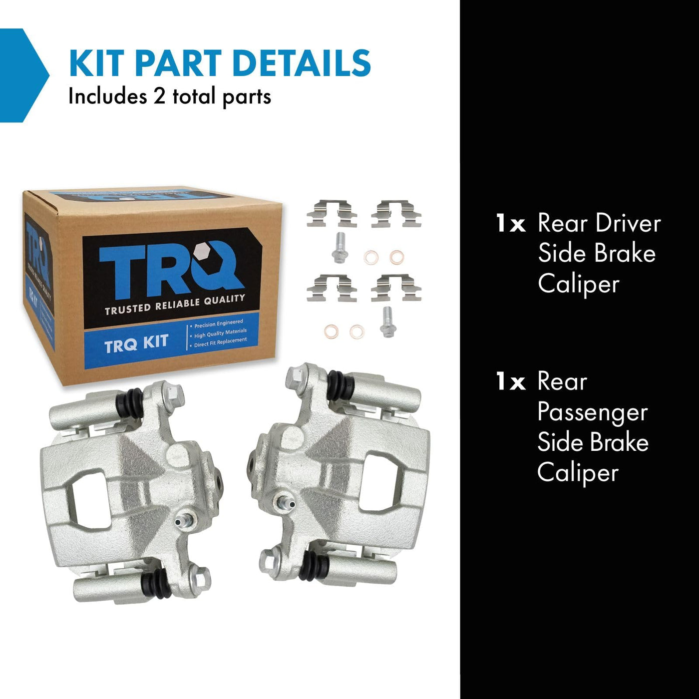 2 Piece Brake Caliper SetKit Includes(1) Rear Driver Side Brake Caliper(1) Rear Passenger Side Brake CaliperFitmentCompatible with: 2013-22 Nissan Altima Rear Driver & Passenger SideCompatible with: 2002-06 Nissan Altima Rear Driver & Passenger SideCompatible with: 2004-06 Nissan Maxima Rear Driver & Passenger SideCompatible with: 2019-22 Nissan Maxima Rear Driver & Passenger SideCompatible with: 2003 Nissan Maxima From 2/01/03 Production Date Rear Driver & Passenger SideProduct AttributesQuantity: 2 PieceIncludes: BracketIncludes: HardwareProduct Features High-Temperature EPDM Seals and Boots: Improved resistance to thermal deterioration Electrostatic High Heat Powder Coating: Resist rust and corrosion Racing-Grade Silicone Lubricant Hardware and Abutment Kit Included 100% New ComponentsItem DetailsTRQ brake calipers are made from premium raw materials designed to restore original performance. All TRQ calipers are new, so there will never be a core charge with your TRQ purchase. TRQ brake calipers include upgraded seals, washers, abutment kits and brackets where applicable to ensure a complete repair. TRQ recommends replacing your calipers in pairs with new brake pads and brake rotors to ensure components wear evenly and avoid multiple repairs of the same system. All products are fit and road-tested in our Massachusetts R&D facility to ensure we deliver on our promise of Trusted Reliable Quality.Reference NumbersACDelco: 18FR2220C, 18FR2221CBBB Industries: 99-00567L-C, 99-00567R-CCARDONE Reman: 19-B2780, 19-B2781DFC Calipers Outright Program - Archived: 331-67644, 331-67645Nugeon: 22-00567L, 22-00567RRaybestos Brakes: FRC11547, FRC11547N, FRC11548, FRC11548N, FRC12045N, FRC12046N, FRC12272UAP: C42555, C42556UCX: 14-7168, 14-7169
