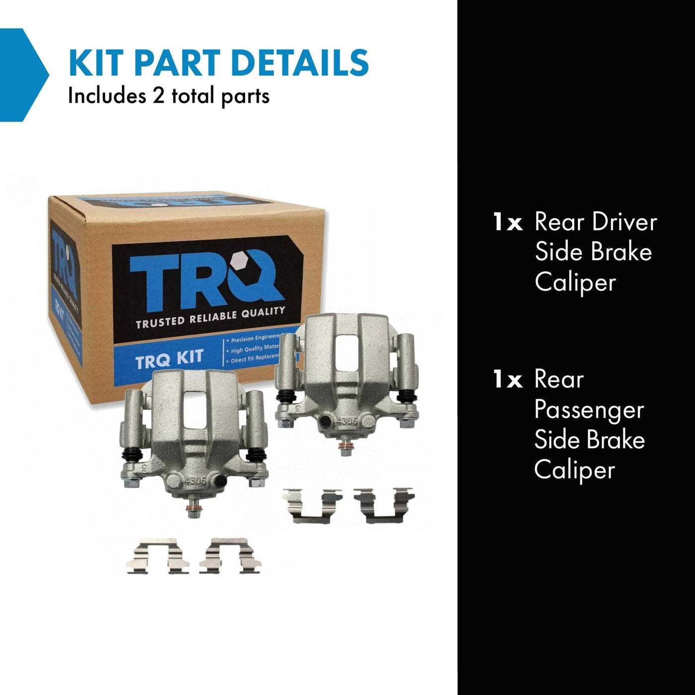 2 Piece Brake Caliper SetKit Includes(1) Rear Driver Side Brake Caliper(1) Rear Passenger Side Brake CaliperFitmentCompatible with: 2003-07 Nissan Murano Rear Driver & Passenger SideCompatible with: 2003-04 Infiniti G35 with Single Piston Calipers Rear Driver & Passenger SideCompatible with: 2004-09 Nissan Quest Rear Driver & Passenger SideCompatible with: 2003-05 Nissan 350Z with Single Piston Calipers Rear Driver & Passenger SideCompatible with: 2005 Infiniti G35 All Wheel Drive Rear Driver & Passenger SideProduct AttributesQuantity: 2 PieceProduct Features High-Temperature EPDM Seals and Boots: Improved resistance to thermal deterioration Electrostatic High Heat Powder Coating: Resist rust and corrosion Racing-Grade Silicone Lubricant Hardware and Abutment Kit Included 100% New ComponentsItem DetailsTRQ brake calipers are made from premium raw materials designed to restore original performance. All TRQ calipers are new, so there will never be a core charge with your TRQ purchase. TRQ brake calipers include upgraded seals, washers, abutment kits and brackets where applicable to ensure a complete repair. TRQ recommends replacing your calipers in pairs with new brake pads and brake rotors to ensure components wear evenly and avoid multiple repairs of the same system. All products are fit and road-tested in our Massachusetts R&D facility to ensure we deliver on our promise of Trusted Reliable Quality.Reference NumbersACDelco: 18FR2362, 18FR2363BBB Industries: 99-00569L-C, 99-00569R-CCARDONE Reman: 19-B2792, 19-B2793DFC Calipers Outright Program - Archived: 331-67648, 331-67649Nugeon: 22-00569L, 22-00569RRaybestos Brakes: FRC11435, FRC11435N, FRC11436, FRC11436NUAP: C42561, C42562UCX: 14-7164, 14-7165