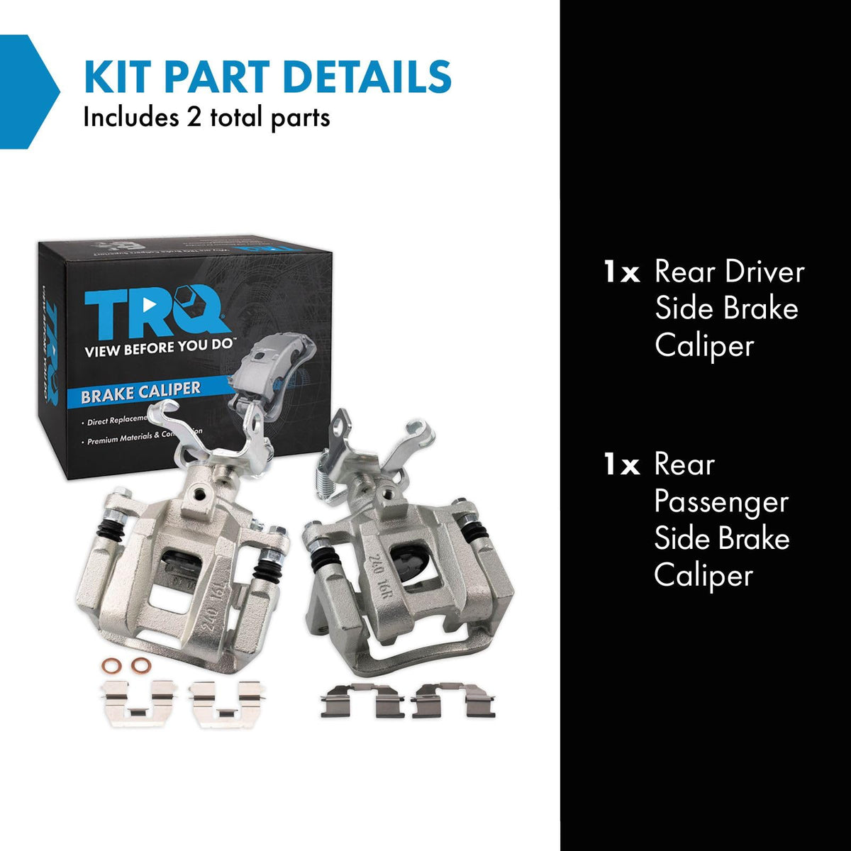 2 Piece Brake Caliper SetKit Includes(1) Rear Driver Side Brake Caliper(1) Rear Passenger Side Brake CaliperFitmentCompatible with: 2016-19 Chevrolet Malibu with Manual Parking Brake Rear Driver & Passenger SideProduct AttributesQuantity: 2 PieceProduct Features Zinc Coated: Long lasting rust prevention EPDM Seals: Enhanced resistance to thermal deterioration No Core Charge: 100% new components Hardware and Abutment Kit Included: Complete repair in a single purchase Direct Replacement: No modifications necessaryItem DetailsTRQ brake calipers are made from premium raw materials designed to restore original performance. All TRQ calipers are new, so there will never be a core charge with your TRQ purchase. TRQ brake calipers include upgraded seals, washers, abutment kits and brackets where applicable to ensure a complete repair. TRQ recommends replacing your calipers in pairs with new brake pads and brake rotors to ensure components wear evenly and avoid multiple repairs of the same system. All products are fit and road-tested in our Massachusetts R&D facility to ensure we deliver on our promise of Trusted Reliable Quality.Reference NumbersCARDONE Reman: 18-B5558, 18-B5559Raybestos Brakes: FRC12893C