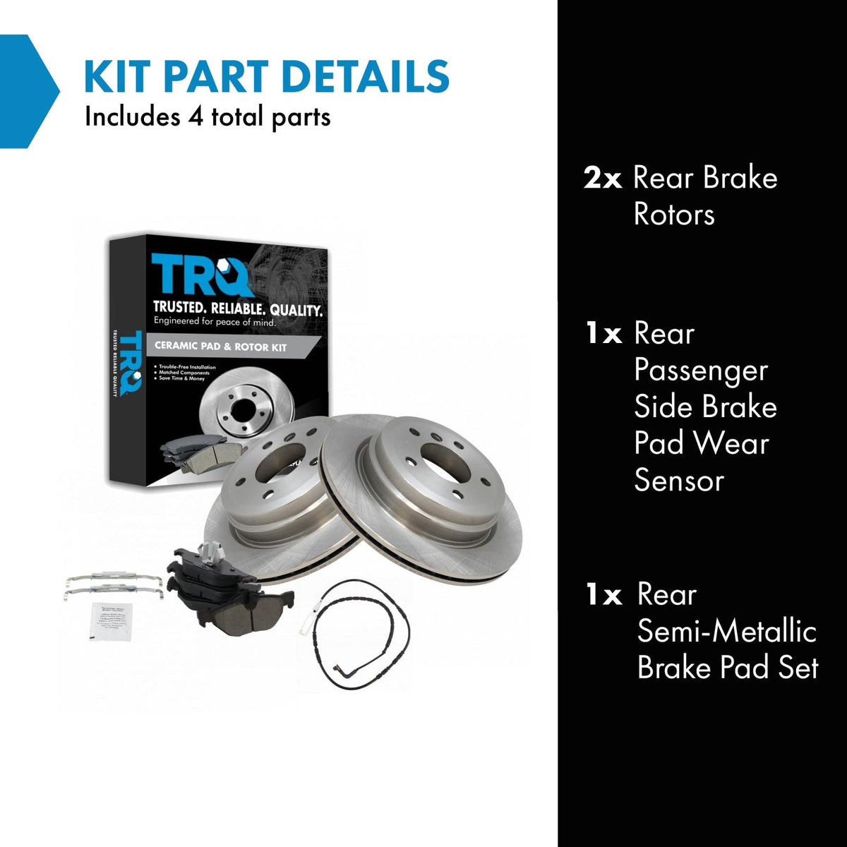 Semi-Metallic Brake Pad & Rotor KitKit Includes(1) Rear Passenger Side Brake Pad Wear Sensor(1) Rear Semi-Metallic Brake Pad Set(2) Rear Brake RotorsFitmentCompatible with: 2007-09 BMW 328i Wagon Rear with Pad Wear SensorCompatible with: 2007-09 BMW 328i Convertible Rear with Pad Wear SensorCompatible with: 2009-12 BMW 328i xDrive Rear with Pad Wear SensorCompatible with: 2012-13 BMW 328i Convertible L6 3.0L Rear with Pad Wear SensorCompatible with: 2011 BMW 328i Wagon Rear with Pad Wear SensorCompatible with: 2011 BMW 328i Convertible Rear with Pad Wear SensorCompatible with: 2007-08 BMW 328xi Rear with Pad Wear SensorCompatible with: 2013 BMW 328i xDrive L6 3.0L Rear with Pad Wear SensorCompatible with: 2012 BMW 328i Wagon L6 3.0L Rear with Pad Wear SensorProduct AttributesRear Brake Rotor Diameter: 11.81 in. (300mm)Wheel Lug Count: 5 LugBrake Pad Friction Material: Semi-MetallicRear Brake Rotor Venting Type: VentedProduct Features Positive Molded - Less dust resulting in clean wheels G3000 Casting Alloy - Reduced noise and improved wear resistance Application Specific Design - Extended service life, no modificationsItem DetailsTRQ brake kits are designed to restore your brake system to like-new performance. TRQ brake pads are positive molded, thermal scorched, chamfered, and utilize a multi-layer shim for enhanced performance and service life. TRQ rotors have a non-directional finish that reduces the break-in period for new rotors as well as reducing vibrations throughout the rotors lifecycle. All products are fit and road-tested in our Massachusetts R&D facility to ensure we deliver on our promise of Trusted Reliable Quality.Reference NumbersAimco: 34317Altrom Imports: 0841602, WK548Bendix: PRT6042BMW: 34216774692, 34216790761, 34356762253, 34356789445Centric Parts: 116.34034DIY Solutions: BFS00189DuraGo: BR900774Hollander: 533-50136PAGID Racing: 355250731Raybestos Brakes: 980495, 980495FZN, 980495P, 980495R, EWS43SMP: PWS105Standard Motor Products: PWS105Wagner: BD180121