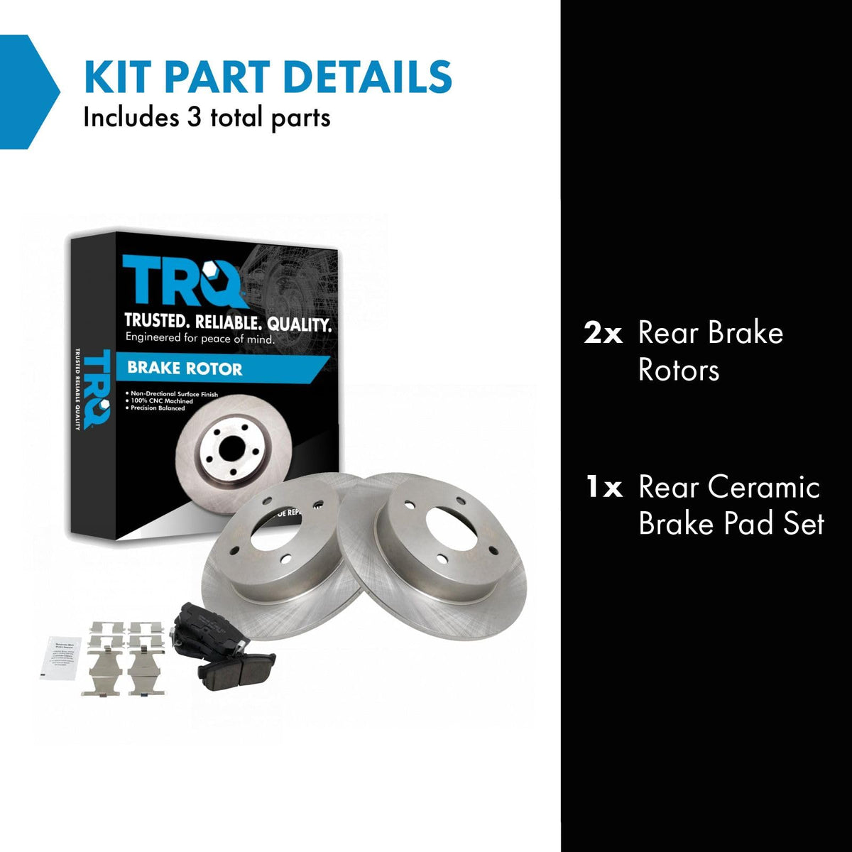 Ceramic Brake Pad & Rotor KitKit Includes(1) Rear Ceramic Brake Pad Set(2) Rear Brake RotorsFitmentCompatible with: 1993-01 Nissan Altima RearCompatible with: 2000-01 Nissan Sentra RearCompatible with: 1999-01 Infiniti G20 RearCompatible with: 1991-96 Infiniti G20 RearProduct AttributesRear Brake Rotor Diameter: 10.16 in. (258mm)Wheel Lug Count: 4 LugBrake Pad Friction Material: CeramicBrake Pad Bonding Type: Premium PosiRear Brake Rotor Venting Type: SolidProduct Features Positive Molded - Less dust resulting in clean wheels G3000 Casting Alloy - Reduced noise and improved wear resistance Application Specific Design - Extended service life, no modificationsItem DetailsTRQ brake kits are designed to restore your brake system to like-new performance. TRQ brake pads are positive molded, thermal scorched, chamfered, and utilize a multi-layer shim for enhanced performance and service life. TRQ rotors have a non-directional finish that reduces the break-in period for new rotors as well as reducing vibrations throughout the rotors lifecycle. All products are fit and road-tested in our Massachusetts R&D facility to ensure we deliver on our promise of Trusted Reliable Quality.Reference NumbersAimco: 31058DuraGo: BR31046Hollander: 533-58230, 533-58516INFINITI: 4406031U92, 440604U090, 4406061J90, 440607E690Nissan: 4406031U90, 4406031U92, 440604U090, 4406061J90, 440607E690Raybestos Brakes: 96133, 96133R, 96408, 96408FZN, 96408P, 96408R, EHT540H, MGD540CH, SGD540C